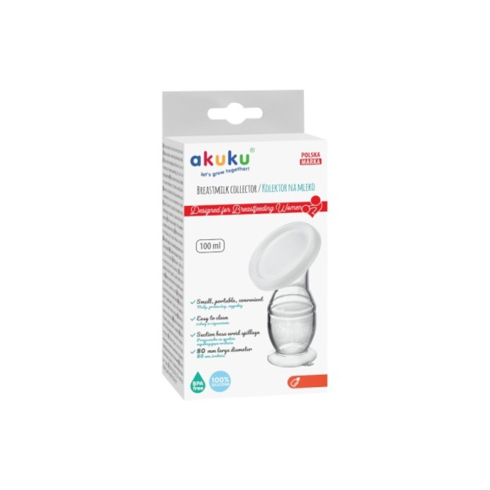 Збирач грудного молока Akuku допомагає матерям-годувальницям збирати молоко, яке витікає з грудей під час годування. Його також можна використовувати як молоковідсмоктувач, коли груди повні молока. Акуратно стискаючи нижню частину колектора і підносячи воронку до грудей, він всмоктує тіло і збирає їжу в силіконовий резервуар. Канавка воронки дозволяє легко наливати продукти в пакет, щоб заморозити їх, коли це необхідно.