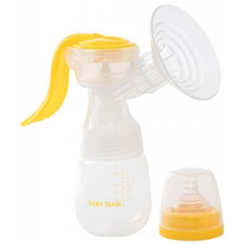 Продумана конфігурація аксесуара дає змогу збирати молоко одразу в пляшечку, що сприяє простоті його застосування та допомагає максимально довго зберігати натуральність і природні властивості молочка для немовля. Він незамінний у ситуаціях, що потребують додаткового зціджування, а також, якщо мамі необхідно терміново відлучитися від малюка й не хвилюватися, що він зголодніє. Його просто й легко збирати, мити та використовувати. М’яка силіконова накладка анатомічної форми надійно і м’яко прилягає до грудей будь-якого розміру. Завдяки ергономічній ручці, що обертається, можна зціджувати молоко з будь-якого комфортного положення. Сумісний з усіма пляшечками з широким горлом Baby team. Молоковідсмоктувач зціджує легко й досить швидко.