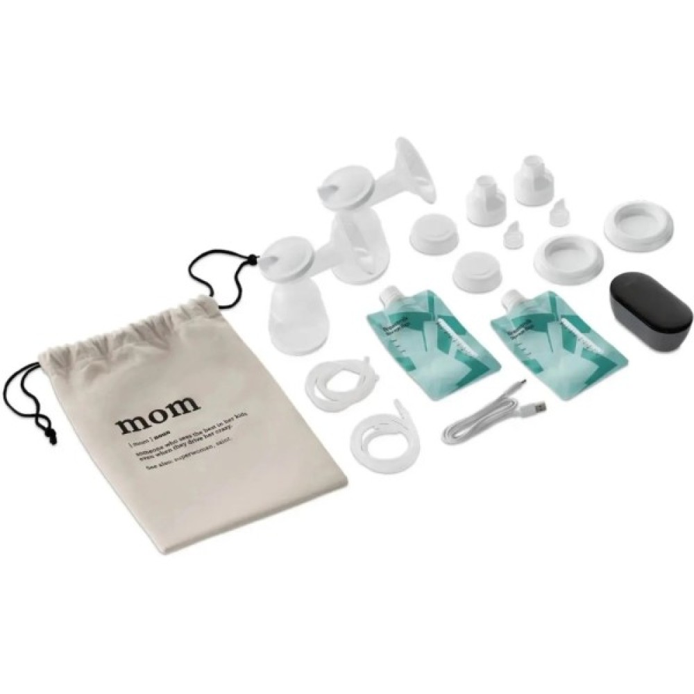 2 пляшки по 150 мл, соски для пляшечок, 2 контейнери для молока, бавовняний футляр для молоковідсмоктування, 2 вирви, 2 кришки для лійок, 2 силіконові трубки, 2 силіконові клапани, роз'єм для підключення двох пляшок, USB-кабель