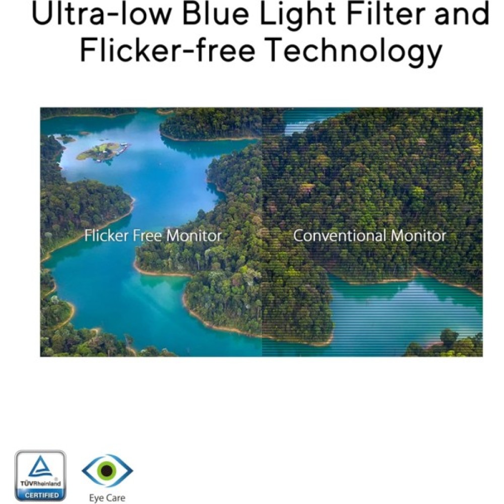 Завдяки технологіям Flicker-Free та Low Blue Light, схваленим сертифікатом TÜV Rheinland, ASUS VP227HF зменшує напруження очей навіть при тривалому використанні, забезпечуючи комфортне переглядання. ASUS DisplayWidget Center дозволяє легко налаштовувати параметри за допомогою миші, що робить роботу з монітором ще більш зручною.