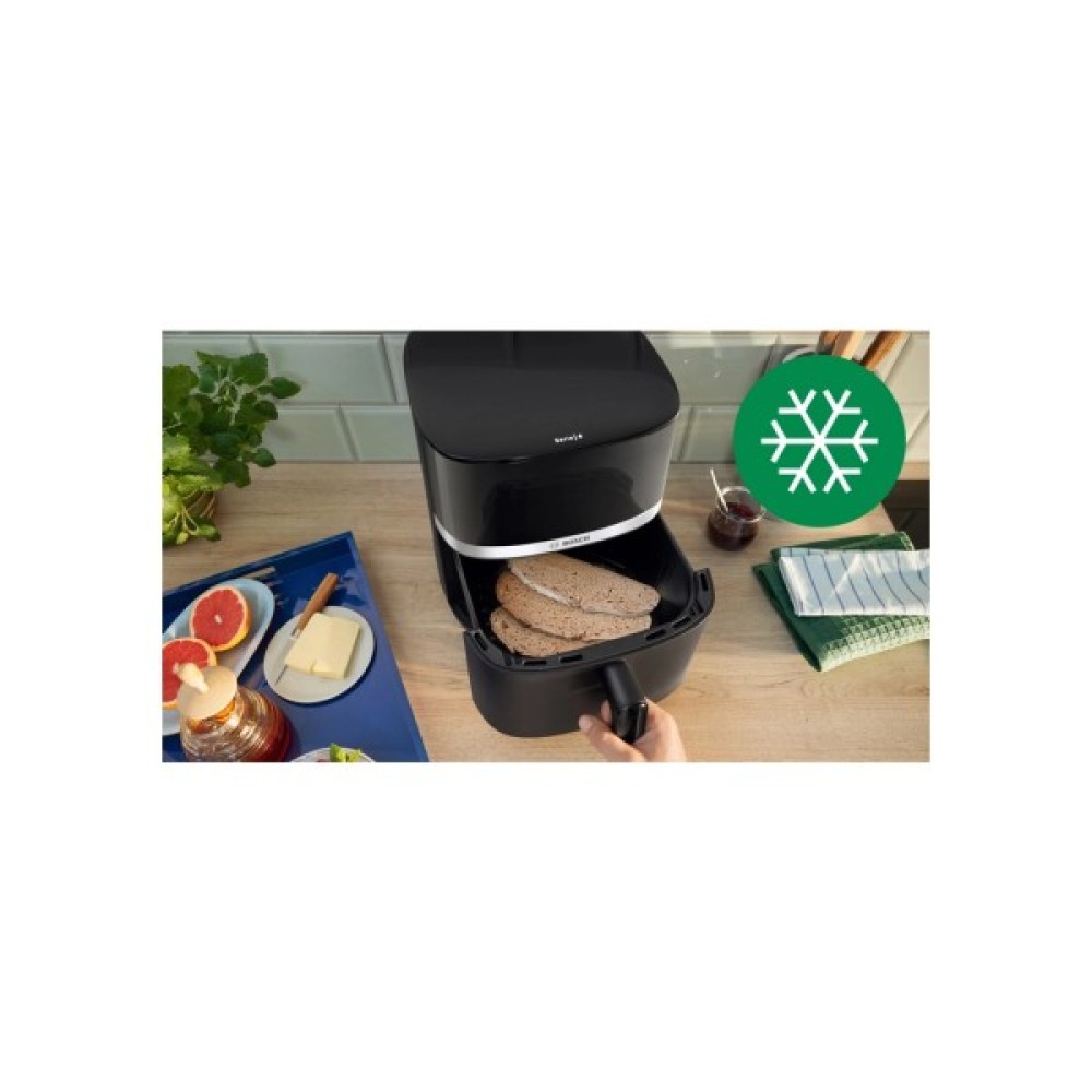 Мультипіч Bosch Serie 6 MAF462B0 – це сучасний кухонний прилад, що поєднує високу продуктивність, зручність та стильний дизайн. Завдяки технології швидкої циркуляції гарячого повітря вона забезпечує рівномірне приготування страв з усіх боків, створюючи апетитну золотисту скоринку зовні та зберігаючи соковитість усередині. Діапазон температур від 40°C до 200°C у поєднанні з подвійними нагрівачами дозволяє швидко готувати різноманітні страви, використовуючи мінімальну кількість олії або взагалі без неї. Велика чаша об’ємом 6.1 л підходить для приготування до чотирьох порцій за один раз, а 7 автоматичних програм (для картоплі фрі, м’яса, птиці, риби, овочів, кексів та булочок) роблять процес приготування максимально простим і зручним.