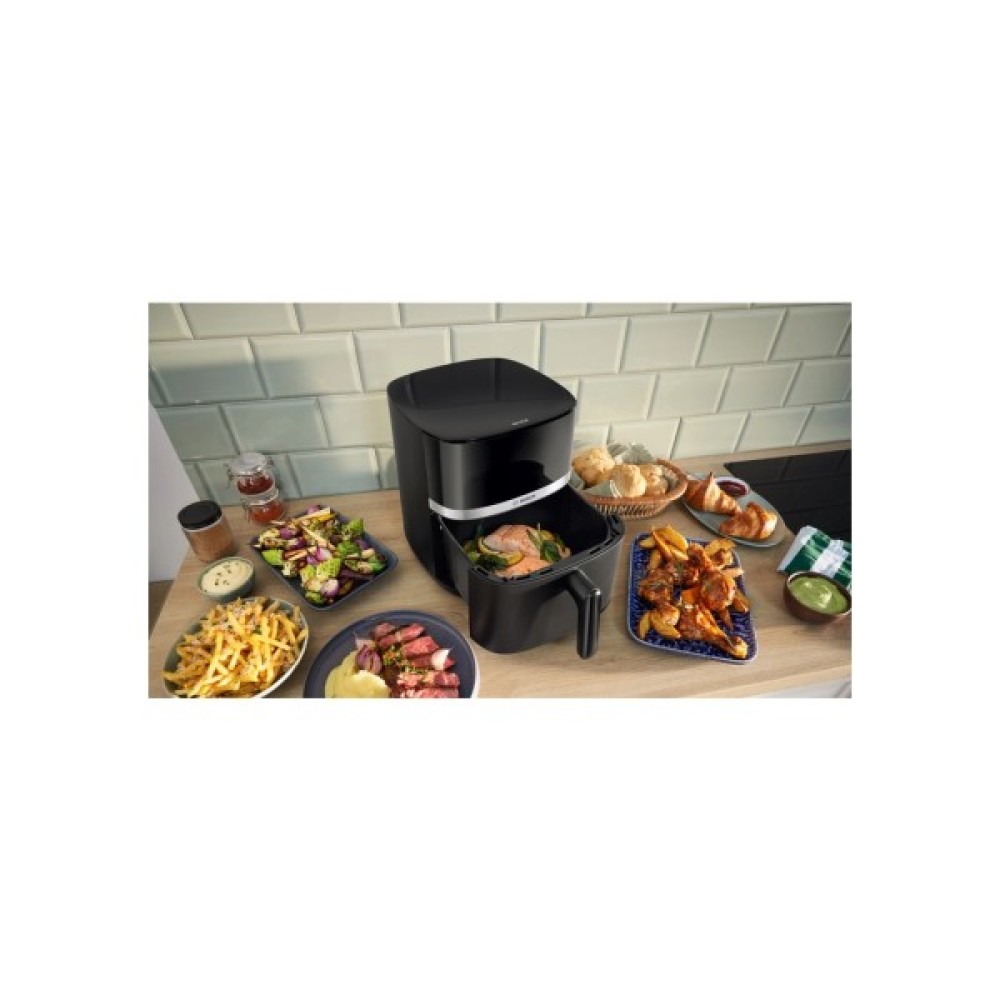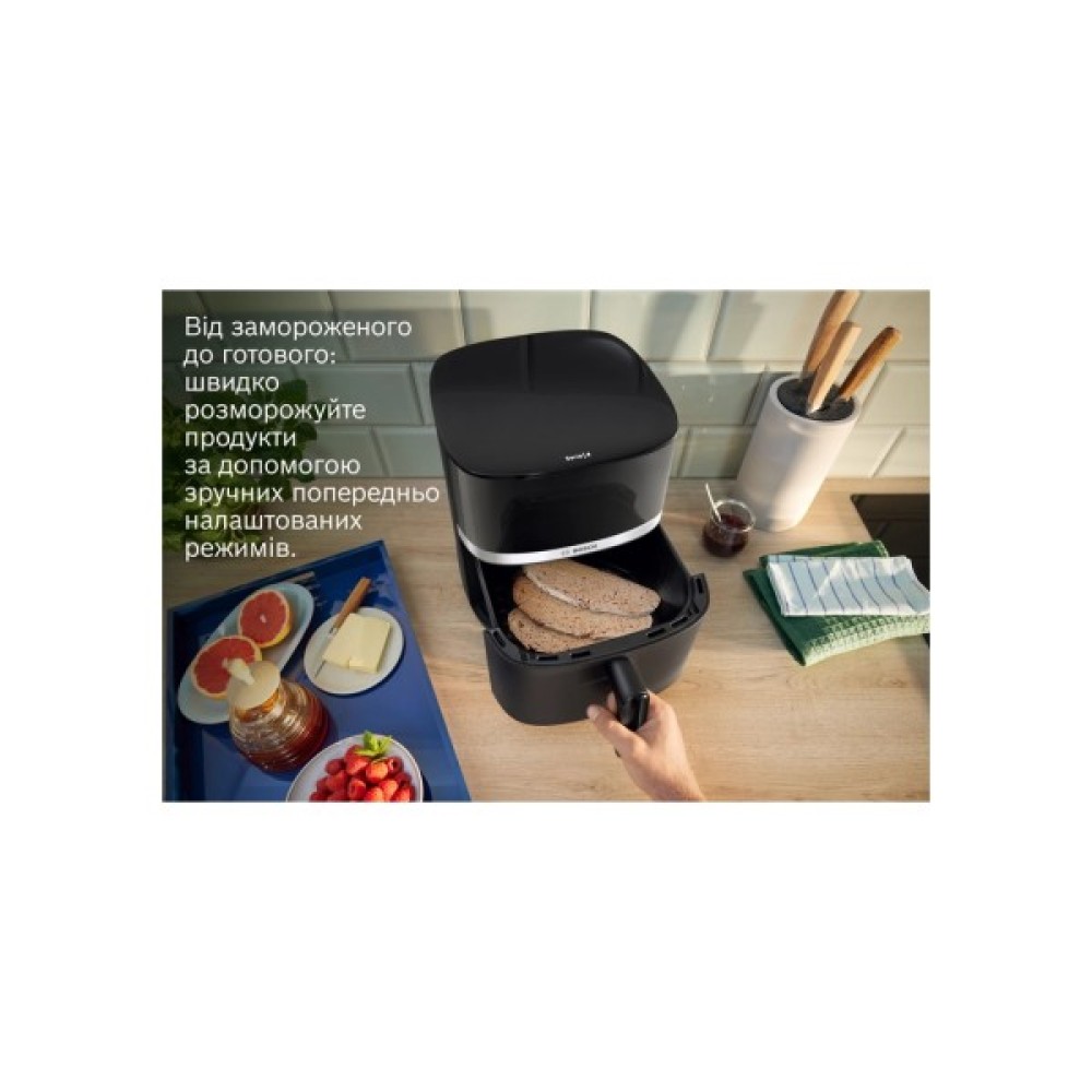 Прилад оснащений сенсорним дисплеєм для легкого управління, а також має додаткові функції: підтримання тепла до 30 хв при температурі 80°C та режим розморожування для різних продуктів. Мультипіч легко чистити завдяки знімній решітці та антипригарному покриттю, які можна мити під проточною водою. Витончений дизайн із чорною матовою поверхнею, стійкою до відбитків пальців, органічно впишеться у будь-який сучасний інтер’єр кухні. У комплект входить знімна решітка, що забезпечує вільну циркуляцію гарячого повітря й мінімізує контакт страв із залишками олії.