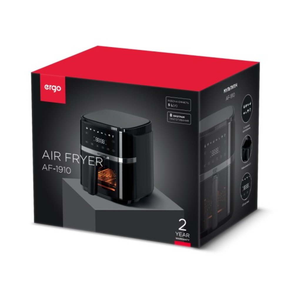 ERGO АF-1910 – це надзвичайно симпатична мультипіч-аерогриль, яка спростить приготування більшості сучасних і традиційних страв. Попри свій компактний розмір, ця модель має містку чашу об’ємом 5 літрів з антипригарним покриттям, чого достатньо для приготування їжі для цілої родини або великої компанії.