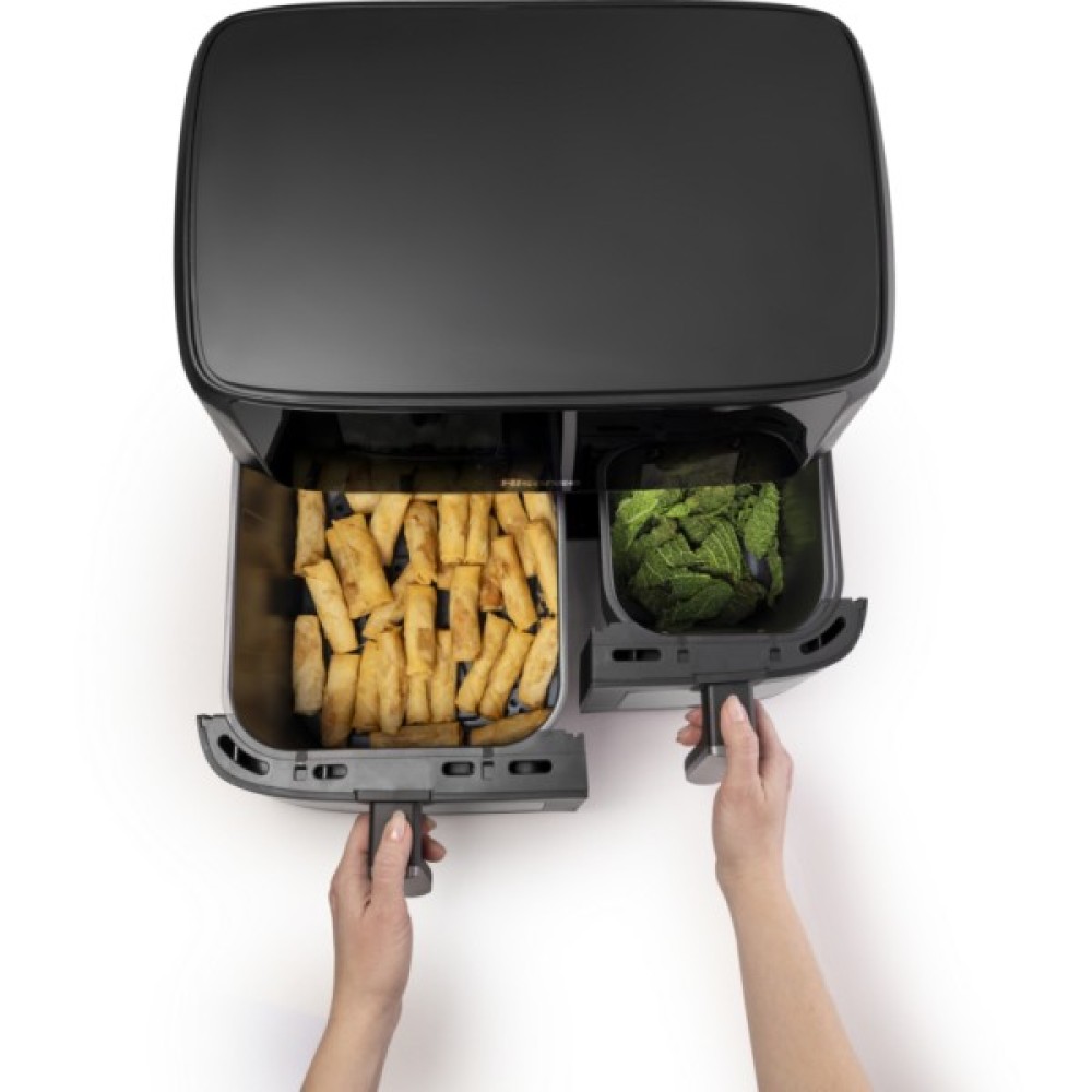 Два окремі кошики, кожен із власним швидкісним нагрівачем і циклонічним вентилятором, дають змогу готувати різні страви одночасно — без змішування ароматів і без очікування.