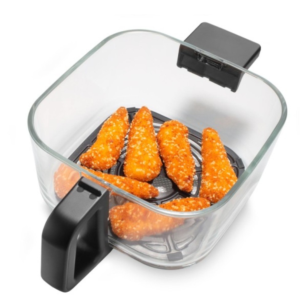 Завдяки технології смаження гарячим повітрям ви можете рівномірно готувати інгредієнти з мінімальним використанням олії, отримуючи при цьому як хрустку скоринку, так і соковиту внутрішню частину. Їжа не плаває в олії, вона готується дбайливіше, здоровіше та швидше. Завдяки круговому огляду в чашу та внутрішньому освітленню, ви можете контролювати процес приготування крок за кроком. Обладнання включає решітку для смаження та протиковзкий килимок.