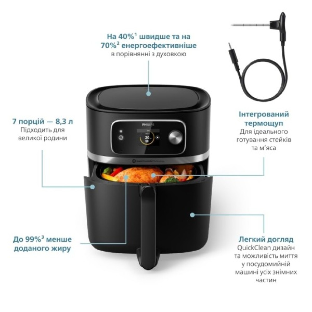 Персоналізація приготування: готуйте стейк та інші білкові страви з улюбленим ступенем прожарювання. Вбудований термометр для інгредієнтів надасть вам свободу творчості.