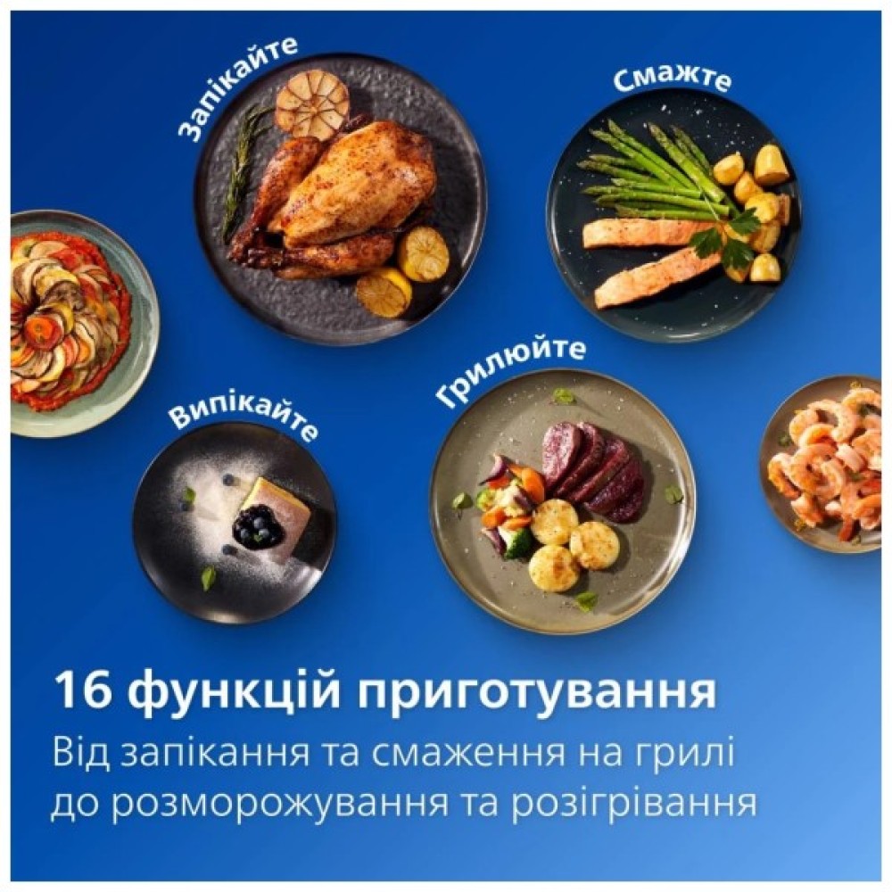 16 функцій приготування, включаючи випічку, гриль, розморожування та розігрів. Вибір налаштувань температури від 40 ℃ та часового діапазону до 24 годин для дегідрації та ферментації.