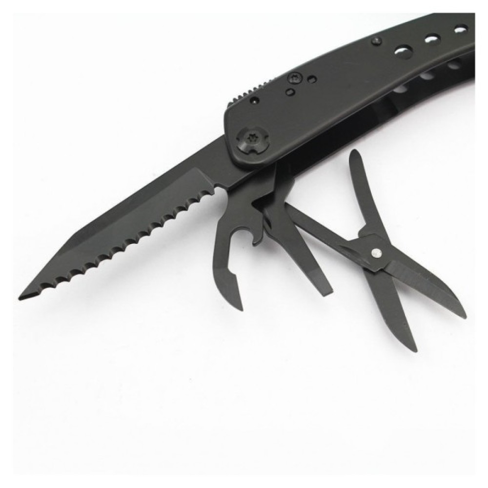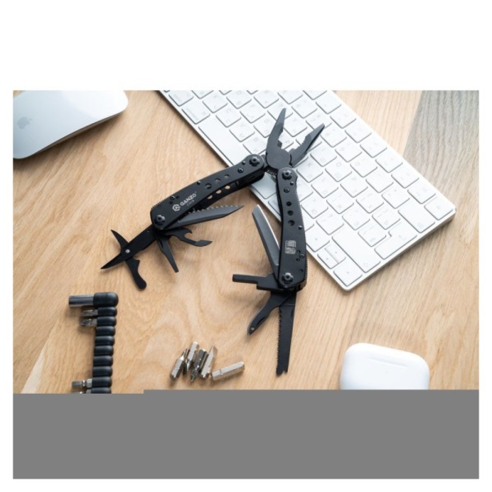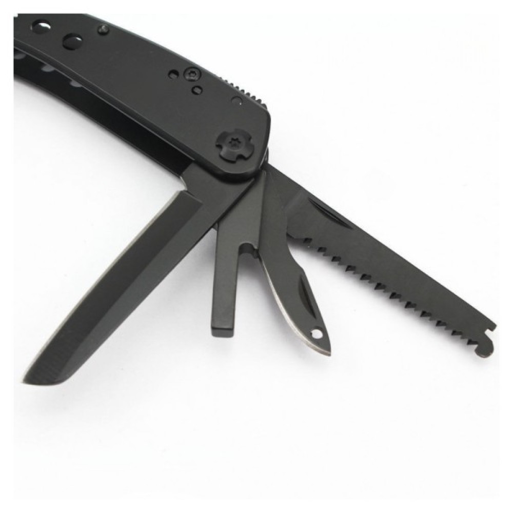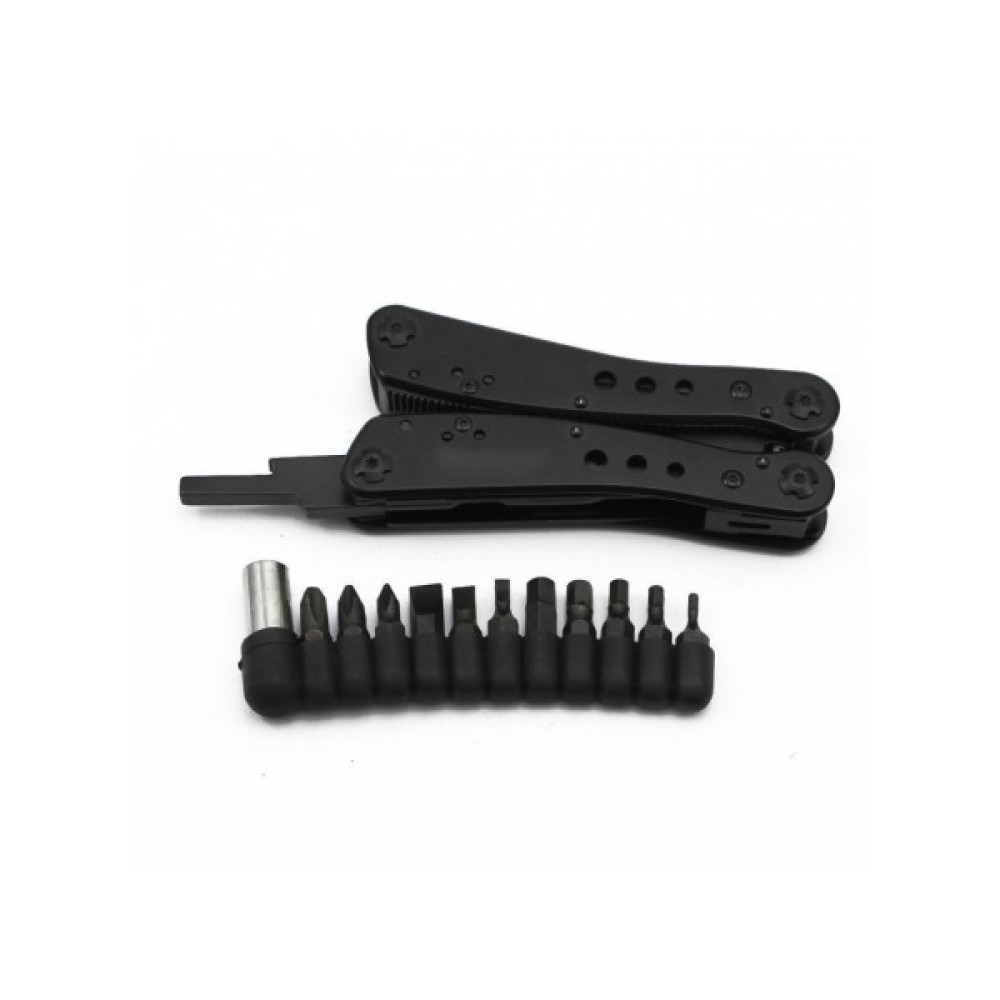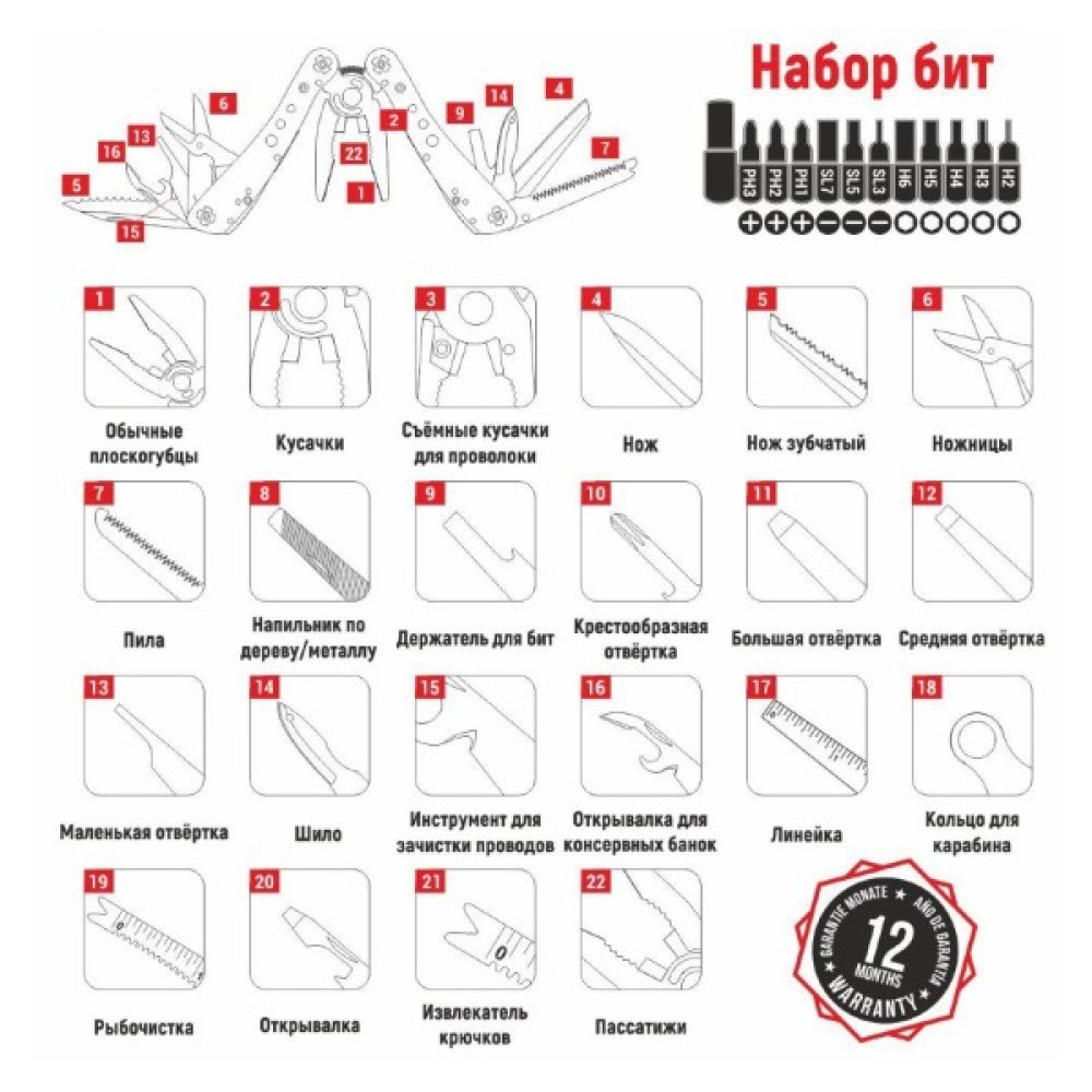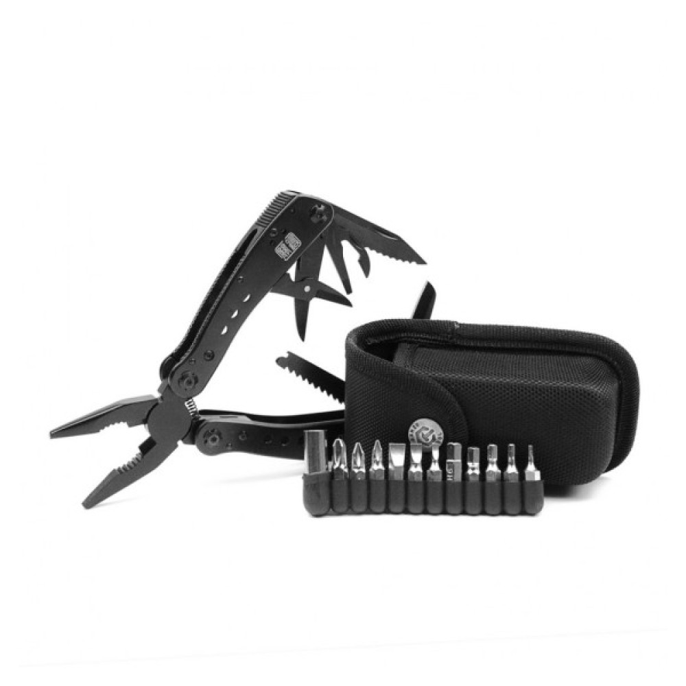 Гострогубці; Плоскогубці; Пила; Бітотримач; Ніж; Ножиці; Шило; Консервний ніж; Відкривачка для пляшок; Викрутка плоска мала; Ніж для зняття ізоляції; ніж з серрейтором; захоплювач для гайок і циліндрів; 12 змінних насадок в комплекті