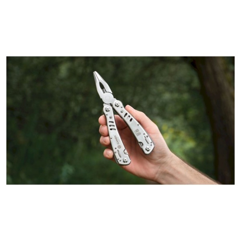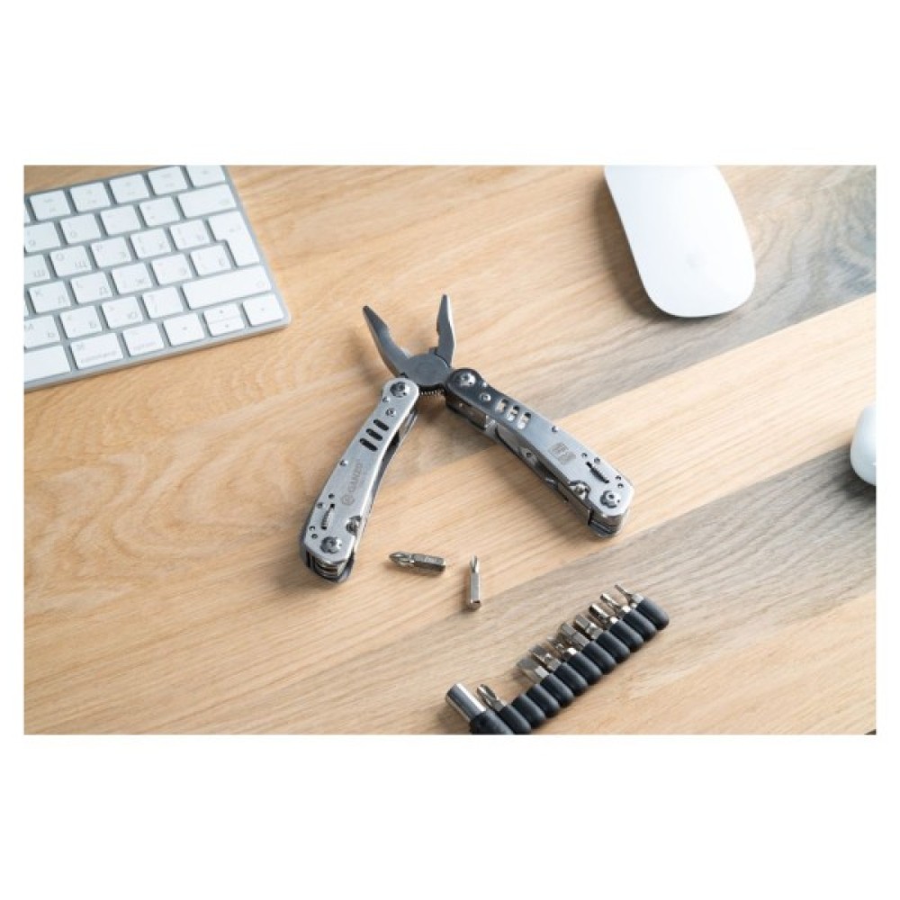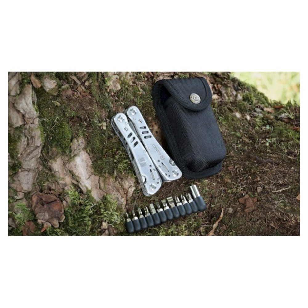 Інструменти в комплекті Гострогубці; Плоскогубці; Пила; Бітотримач; Ножиці; Шило; Консервний ніж; Відкривачка для пляшок; Викрутка плоска мала; Серрейторний ніж; кільце для ключів; паз для зняття ізоляції; захоплювач для гайок і циліндрів; 12 змінних насадок в комплекті