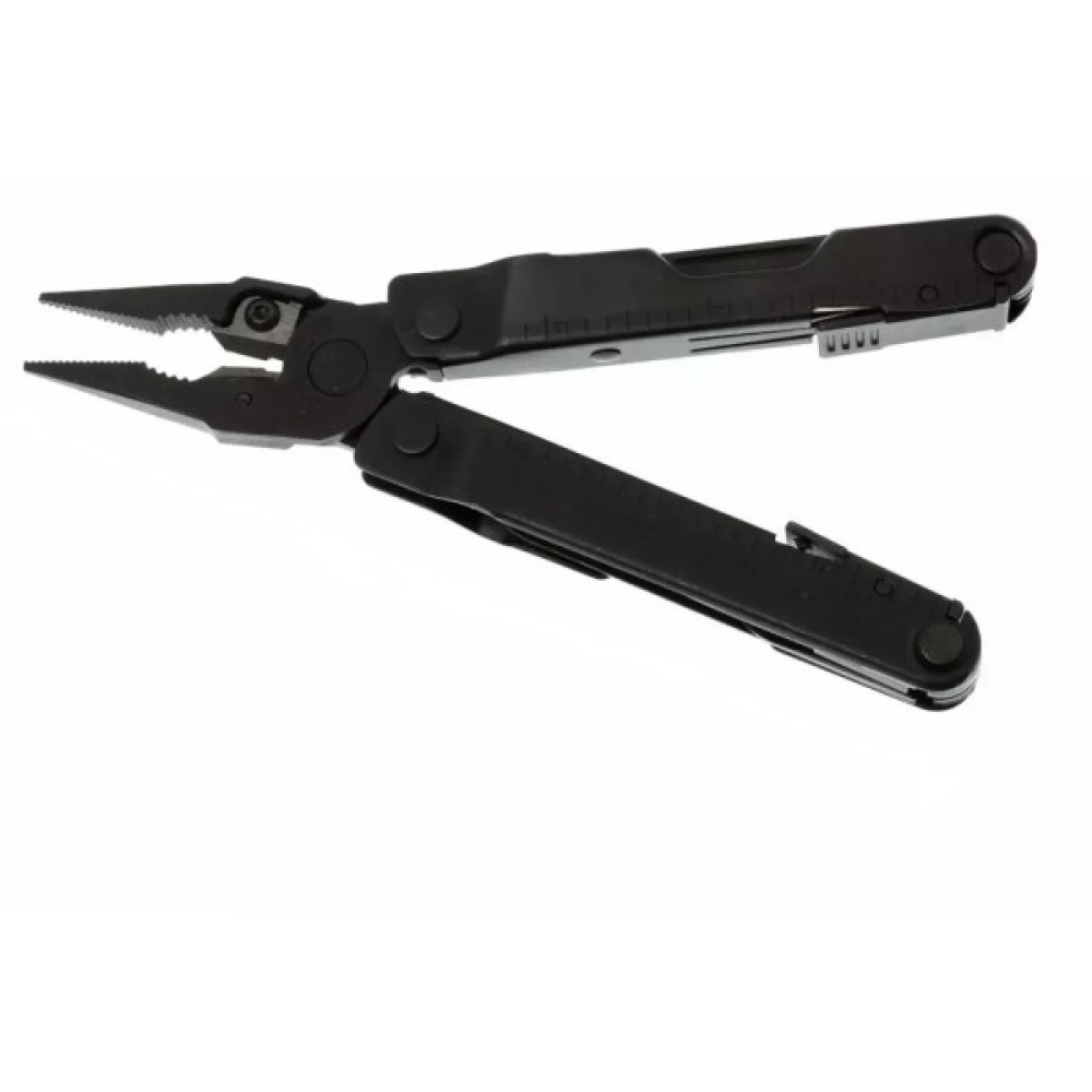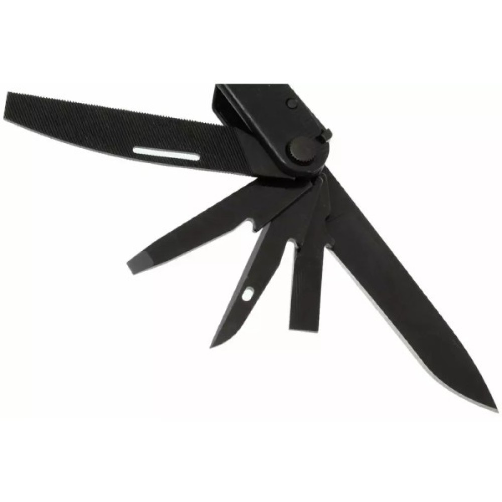 Інструменти в комплекті Гострогубці; Плоскогубці; Пила; Ніж; Шило; Консервний ніж; Відкривачка для пляшок; Інструмент для зачищення проводів; Викрутка плоска мала; Серрейторний ніж; Кусачки змінні; Кусачки змінні для твердого дроту; обтиск електричних проводів; Викрутка велика; Викрутка Phillips; лінійка (8 дюймів / 19 см); напильник по дереву та металу