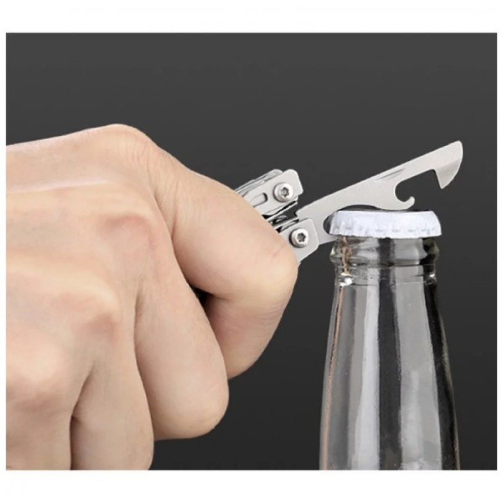 Інструменти в комплекті Гострогубці; Плоскогубці; Викрутка; Ніж; Ножиці; Напилок; Відкривачка для пляшок; Відкривачка для банок; Викрутка плоска; захоплювач для гайок і циліндрів