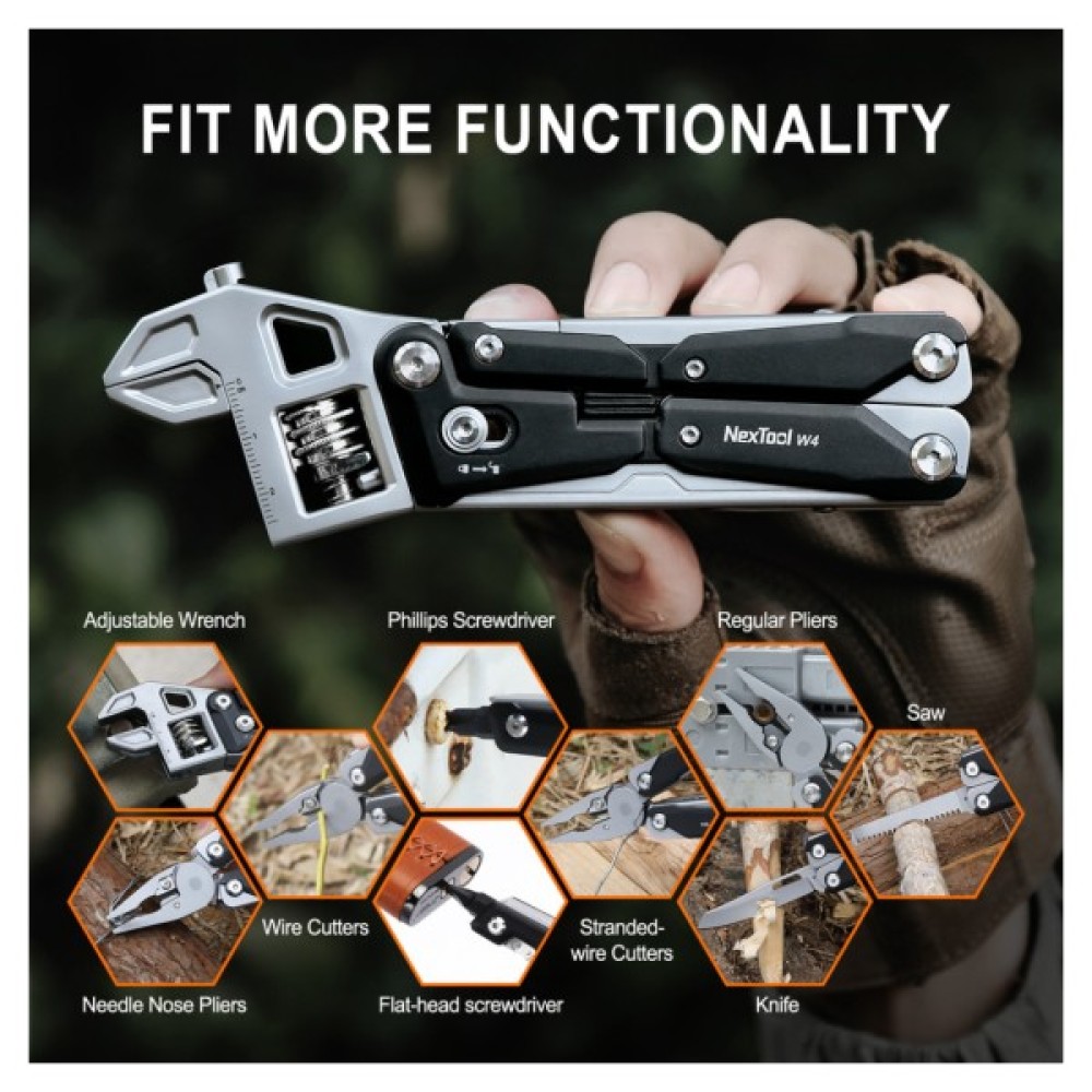 NexTool Wrench W4 — це мультитул для тих, хто не звик вибирати між міцністю та універсальністю. Модель має 2 повнорозмірні інструменти: потужні плоскогубці та розвідний ключ з розкриттям до 25 мм. Ключ оснащений запатентованим храповим механізмом, який дозволяє швидко змінювати захоплення без необхідності складного переналаштування — жодних зайвих рухів, тільки точна та швидка робота!