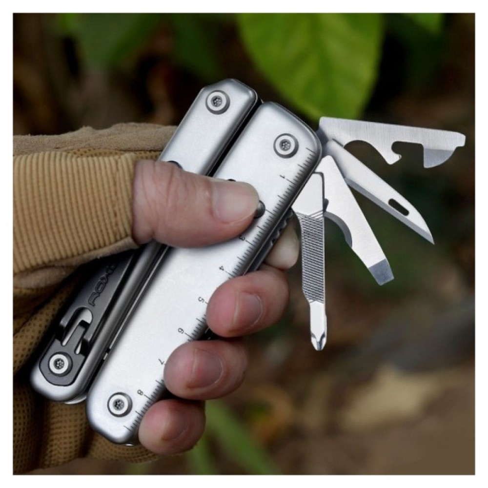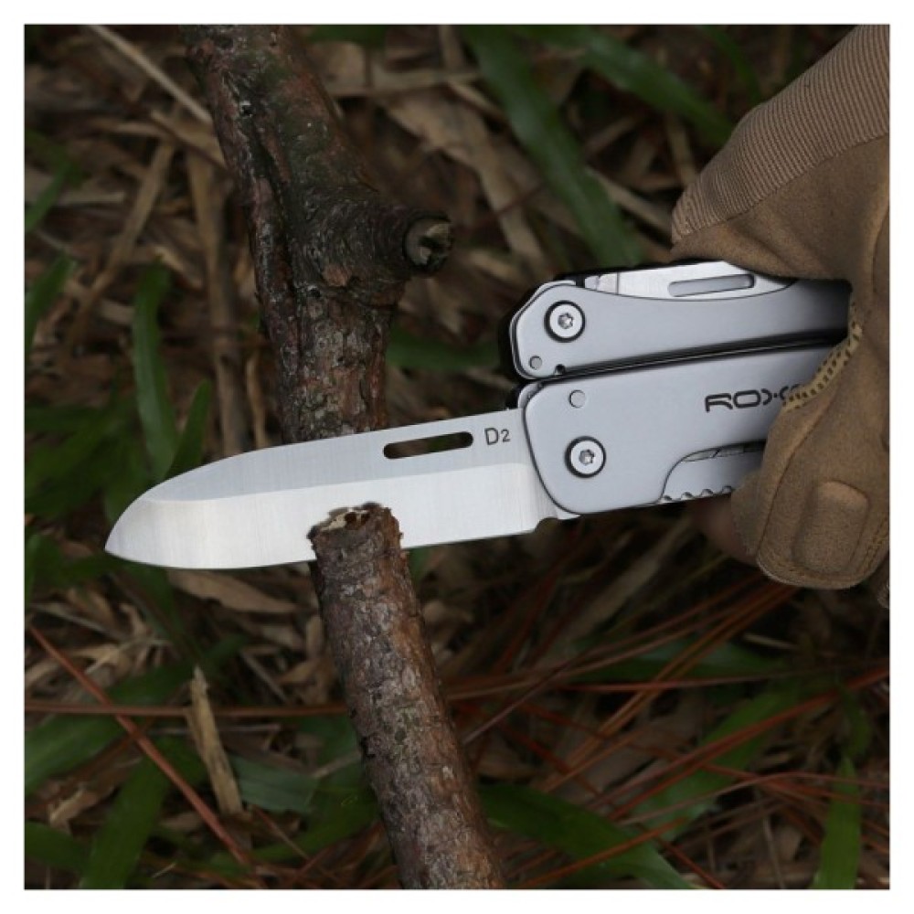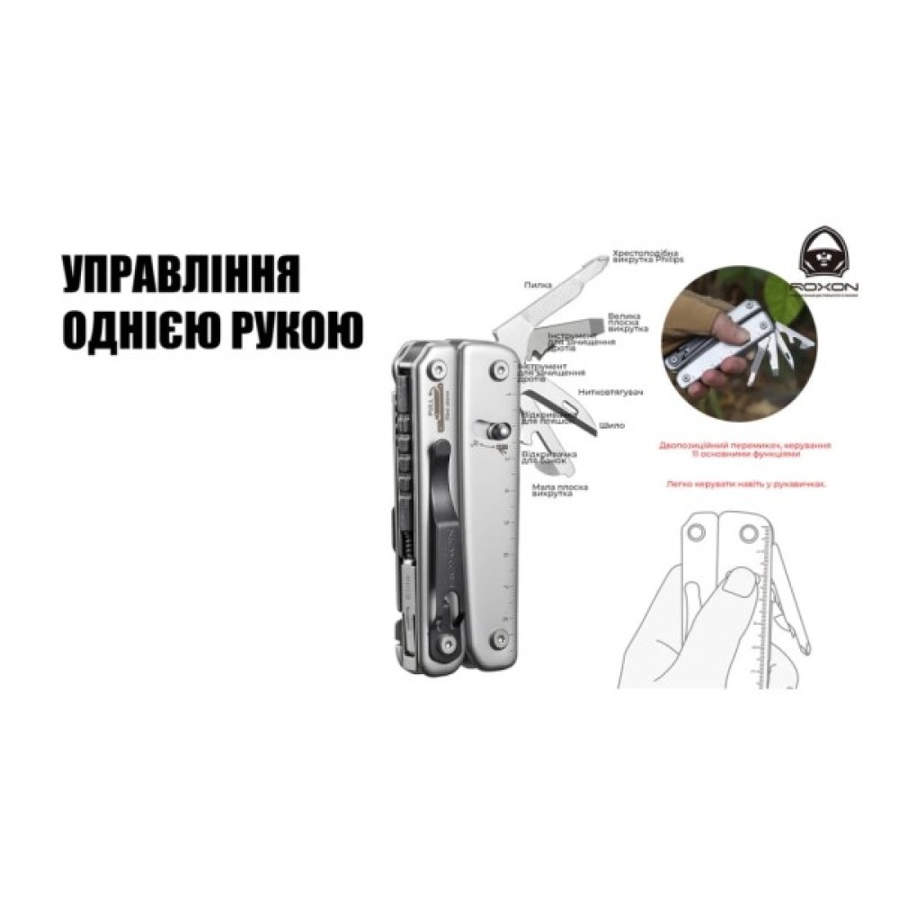 Розміри відкритого мультитула Roxon S803E дорівнюють 15.8 х 11.9 х 2.2 см, а його вага не перевищує 242 г з урахуванням кліпси, яка призначена для фіксації конструкції у кишені сумки чи одягу. Виробник доповнив комплект чохлом для зберігання інструмента, що захищає сталевий корпус від впливу вологи та появи подряпин під час транспортування.