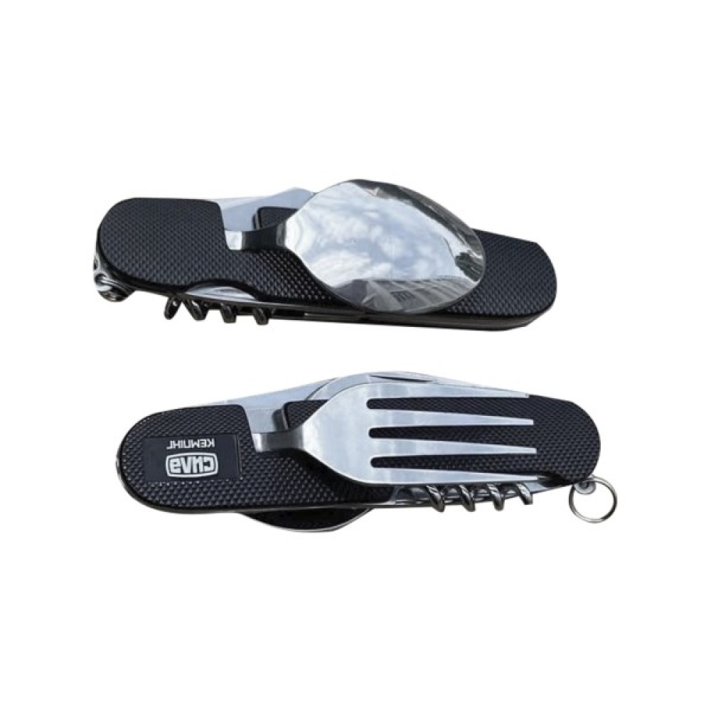 Ніж; Штопор; Консервний ніж; Відкривачка для пляшок; Виделка; Ложка; Крюк для підвішування; льодокол
