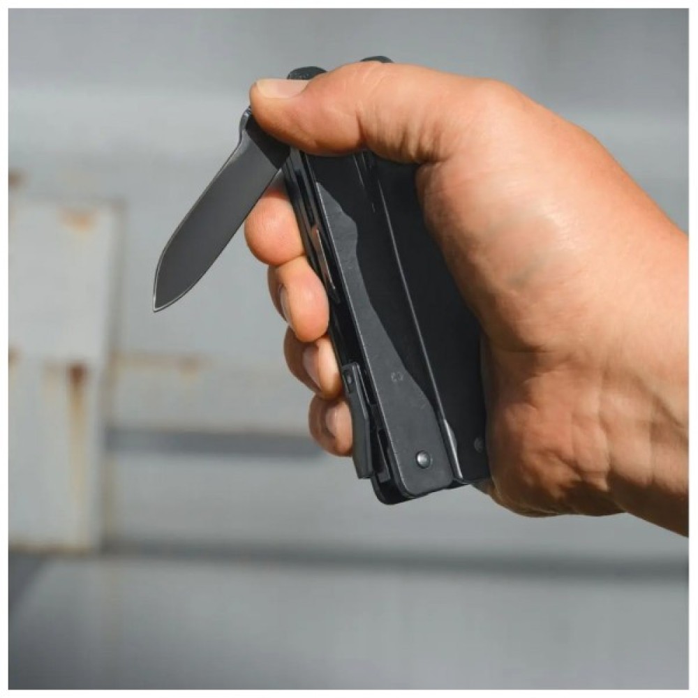 Конструкція з високоякісної нержавної сталі забезпечує довговічність та стійкість до корозії, що робить цей мультитул незамінним помічником у будь-яких умовах. Зручний одноручний механізм відкривання леза та стропоріза дозволяє швидко і безпечно перейти до роботи, навіть коли у вас зайнята рука. Унікальний дизайн з епоксидним покриттям у стилістиці чорного кольору додає елегантності та стриманості.
