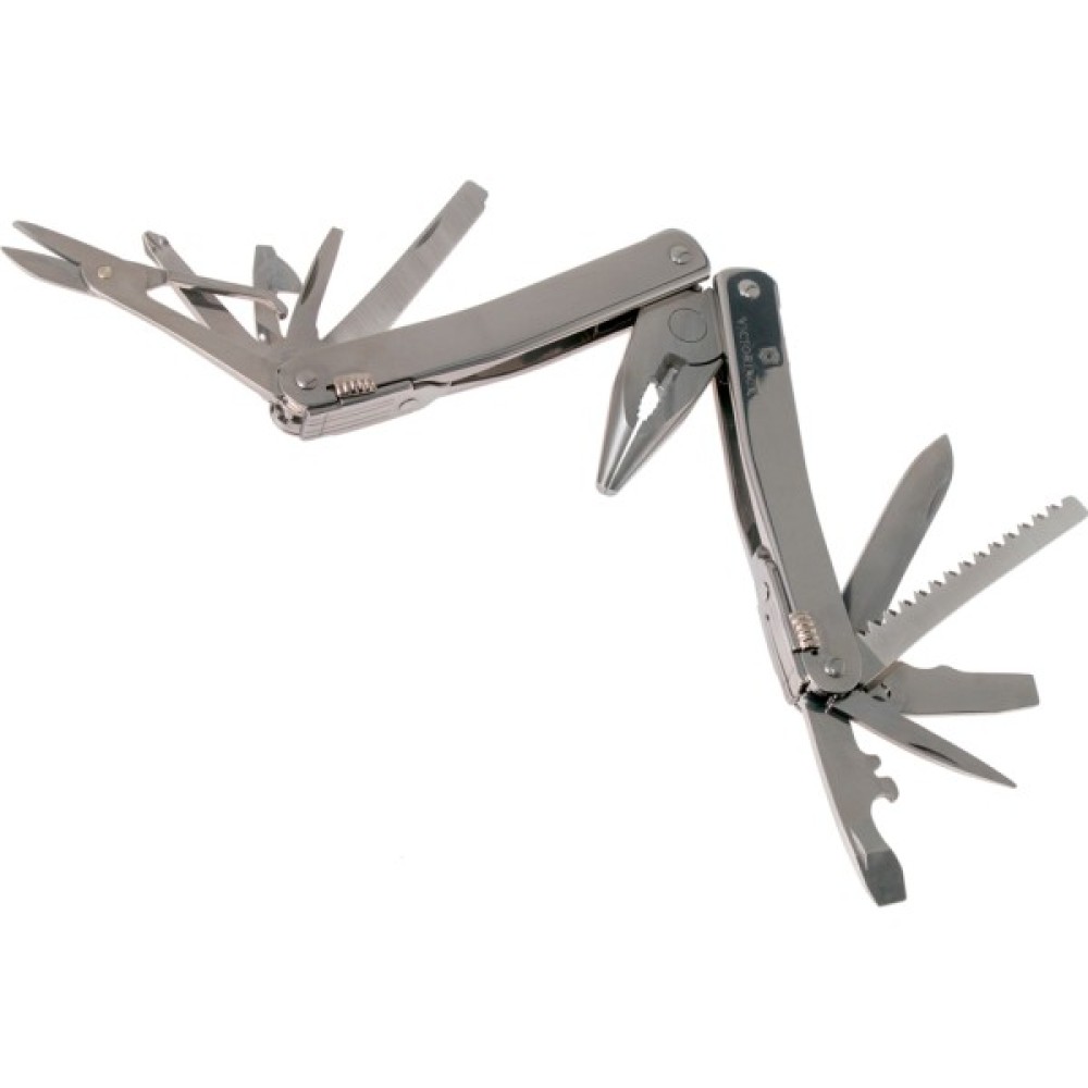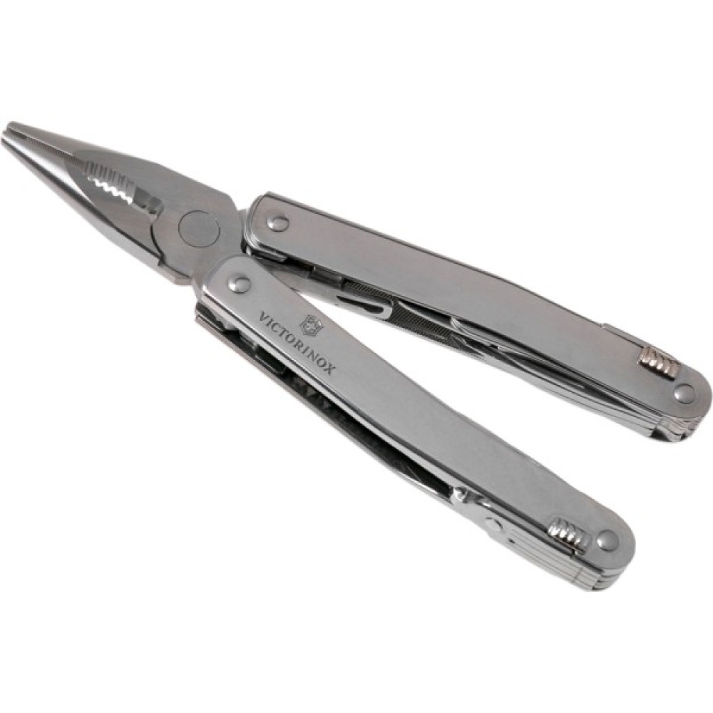 Плоскогубці; Кусачки; Скребок; Ножиці; Шило; Штопор; Консервний ніж; Відкривачка для пляшок; Пилка по дереву; Багатофункціональний гачок; пилка по металу; зубило; різак; викрутка 2 мм; викрутка 3 мм; викрутка плоска велика; інструмент для відкриття коробок; тримач для біт; насадка Torx 10; насадка Torx 15; паз для зняття ізоляції; лезо ножа; надфіль; поперечний різак ізоляції; дротогиб; хрестова викрутка Phillips 1/2; хрестова викрутка Phillips 0; хрестова викрутка Phillips 3; шестигранник Hex 3; шестигранник Hex 4; місце для додаткових біт; муфта для штопора; продольний різак ізоляції; ключ з трещіткою для біт 3.0304; мінівикрутка A3643; подовжувач