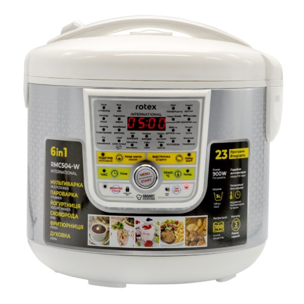 Мультиварка RMC504-W International може замінити кілька кухонних приладів при готуванні їжі. З її допомогою ви зможете приготувати будь-яку страву при мінімальних витратах сил і енергії. Під час використання приладу ви можете вибрати одну з 23 автоматично налаштованих програм для приготування їжі. Вам не потрібно вибирати температуру і час приготування страви - мультиварка RMC504-W International сама про все подбає. Вам необхідно тільки додати продукти і вибрати потрібний режим роботи. В її функціоналі є програми для варіння, тушкування, випікання і смаження. З її допомогою ви можете пригостити домашніх смачною випічкою або смаженим м'ясом і овочами. Якщо ви дотримуєтеся дієтичного харчування, то з функцією парового приготування ви зможете радувати себе смачними і корисними стравами щодня. Для приготування різного виду каш у приладу є кілька різних програм.