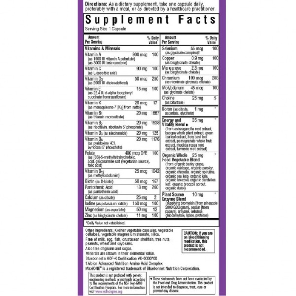 Maxi One, Iron Free — насичена формула різними мікроелементами, не містить заліза. Вона містить критичні поживні речовини, які практично неможливо в потрібній кількості отримати з харчів. Також вона забезпечує поживні речовини в біодоступних формах, що неабияк підвищує їхню засвоюваність організмом. Вітамін А захищає наші легені від інфекцій і пошкоджень. Також надає позитивний ефект на зорові функції. Вітамін D3 сприяє накопиченню кальцію в організмі, захищаючи наші кістки, суглоби, хрящі та зуби. Найголовніша перевага вітаміну С — боротьба з вірусами та запаленнями різного роду. Вітаміни групи В відповідають за здоров'я та стабілізацію нервової системи. Також до складу входять антиоксиданти, цитрусовий біофлавоноїдний комплекс, суміш тропічних суперфруктів (асаї, ацерола, годжі, мангостин і гранат), які нейтралізують дію вільних радикалів і захищають організм від передчасного прискореного старіння.