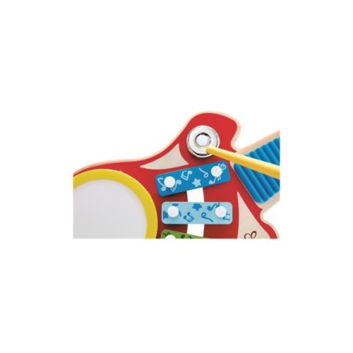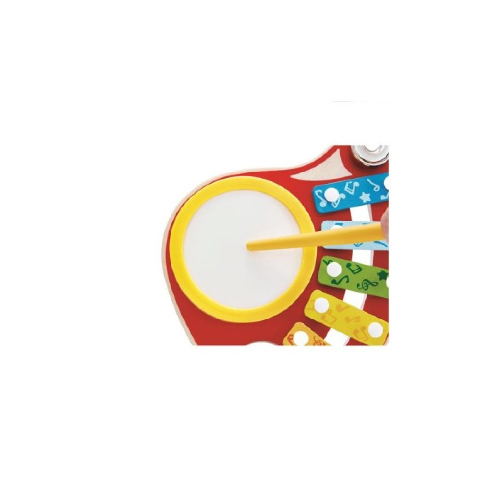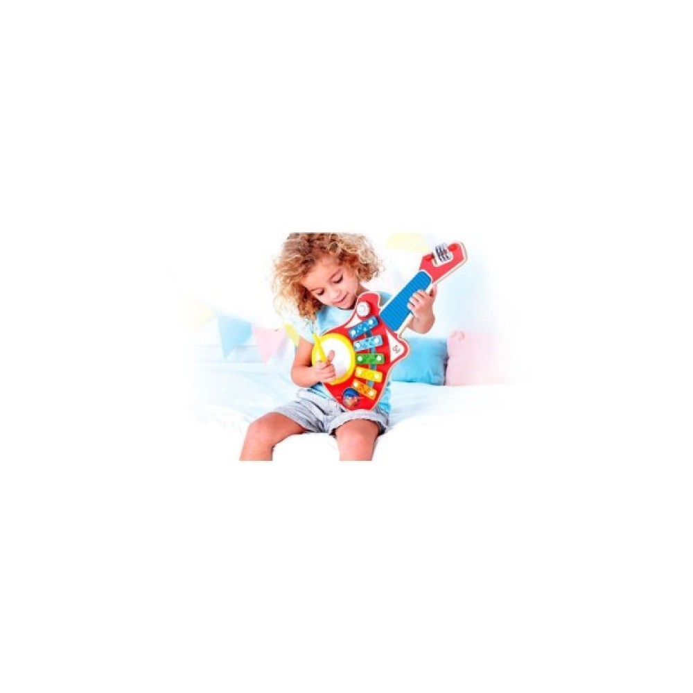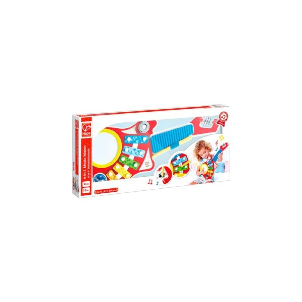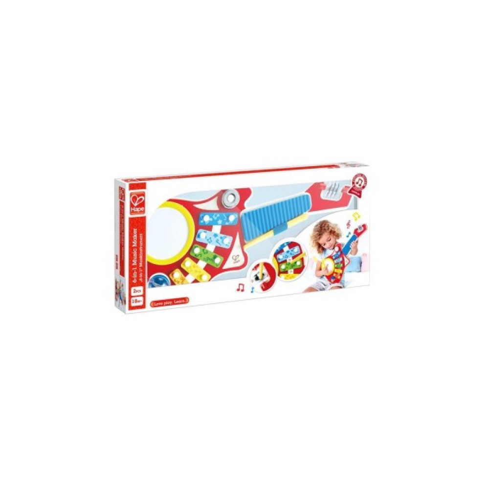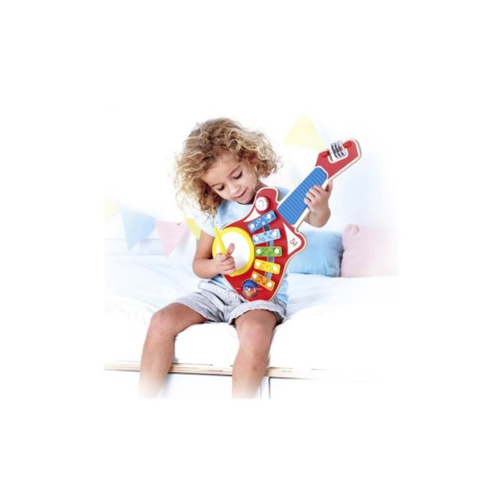 Якщо й існує іграшка, здатна задовольнити усі музичні потреби вашої дитини, так це музичний інструмент 6-в-1. Міні-оркестр у формі гітари містить шість різних музичних інструментів: барабан, ксилофон, брязкальце, дзвіночок, скретч-дошку й бубон.