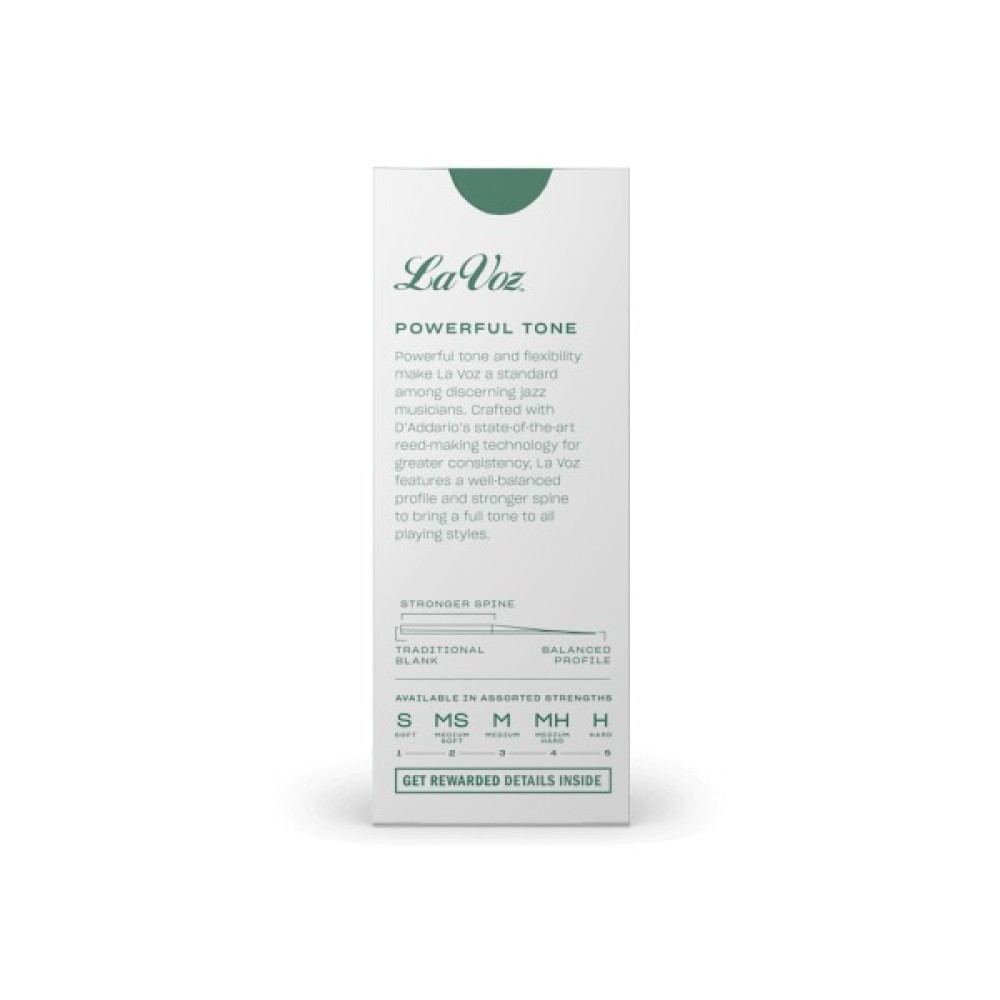 Потужне звучання і тональна гнучкість зробили тростини серії La Voz стандартом серед джазових виконавців. Об'єднавши ці традиції з високоточними технологіями виробництва і фірмовою стабільністю D'Addario, було створено нове покоління La Voz. Чудово збалансований профіль та посилена спинка цих тростин дозволяють отримати по-справжньому повне і об'ємне звучання, незалежно від музичного стилю!
