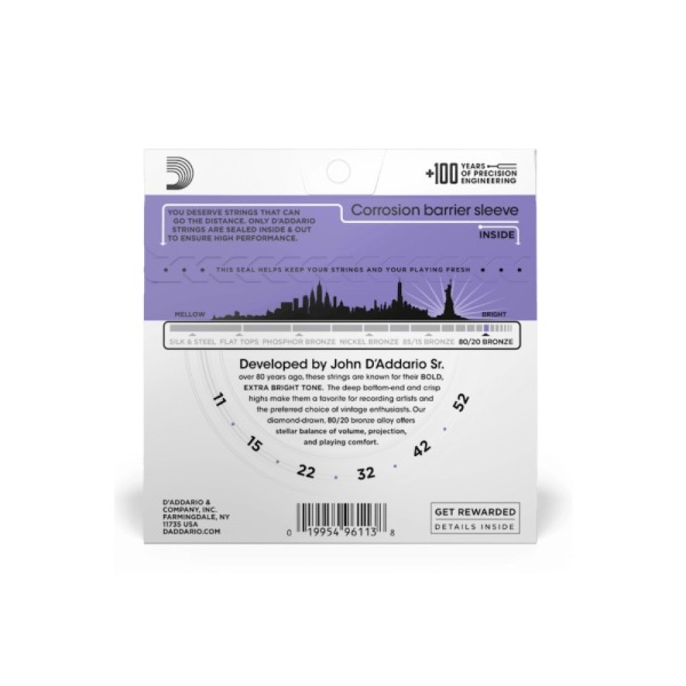 Всі струни для акустичних гітар D`Addario намотані на шестигранних сердечниках з вуглецевої сталі, та в результаті створюють тривале, яскраве звучання з прекрасною інтонацією.