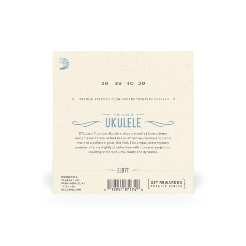 Струни EJ87T виготовлені з титанового моноволокна серії Pro-Arté та оптимізовані для тенорового GCEA ладу. Всі струни з набору виготовляються на власній вдосконаленій лінії екструзії моноволокна D'Addario, що була створена виключно для виробництва струн для музичних інструментів.