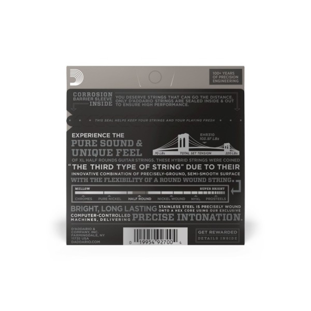 Обмотка струн D'Addario Half Round виготовлена з нержавіючої сталі і ретельно відшліфована до гладкої поверхні. Ексклюзивна технологія нагріву дозволяє цим струнам зберігати яскраве насичене звучання струн з круглою обмоткою.