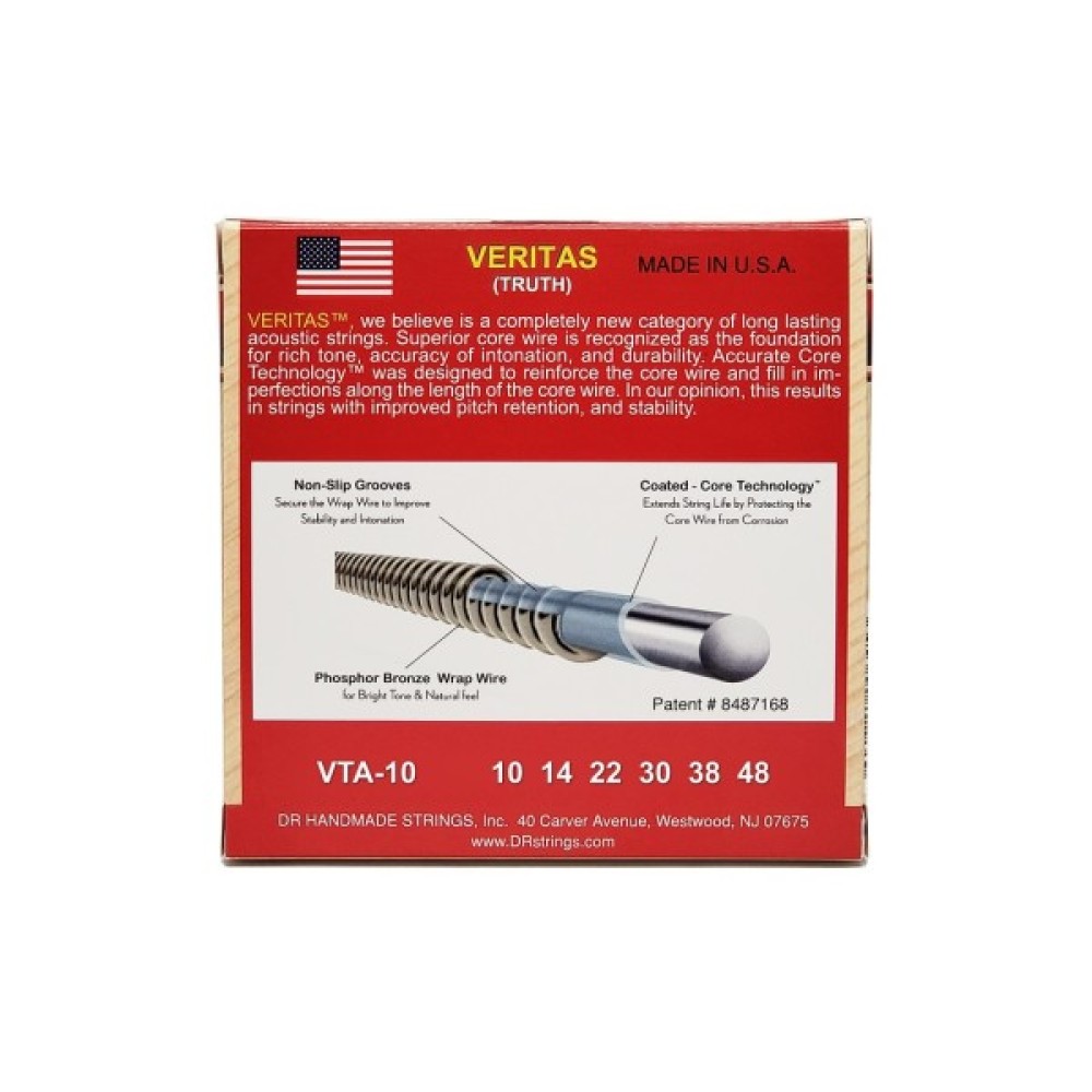 Струни для акустичної гітари VERITAS™ зберігають свій тон, стабільність налаштування та інтонацію завдяки технології Coated Core Technology™, процесу покриття дроту з круглим сердечником, який фіксує дріт на місці та продовжує термін служби струни, захищаючи сердечник від корозії. Обмотка з фосфорної бронзи забезпечує традиційне яскраве звучання і природне відчуття.DR Veritas