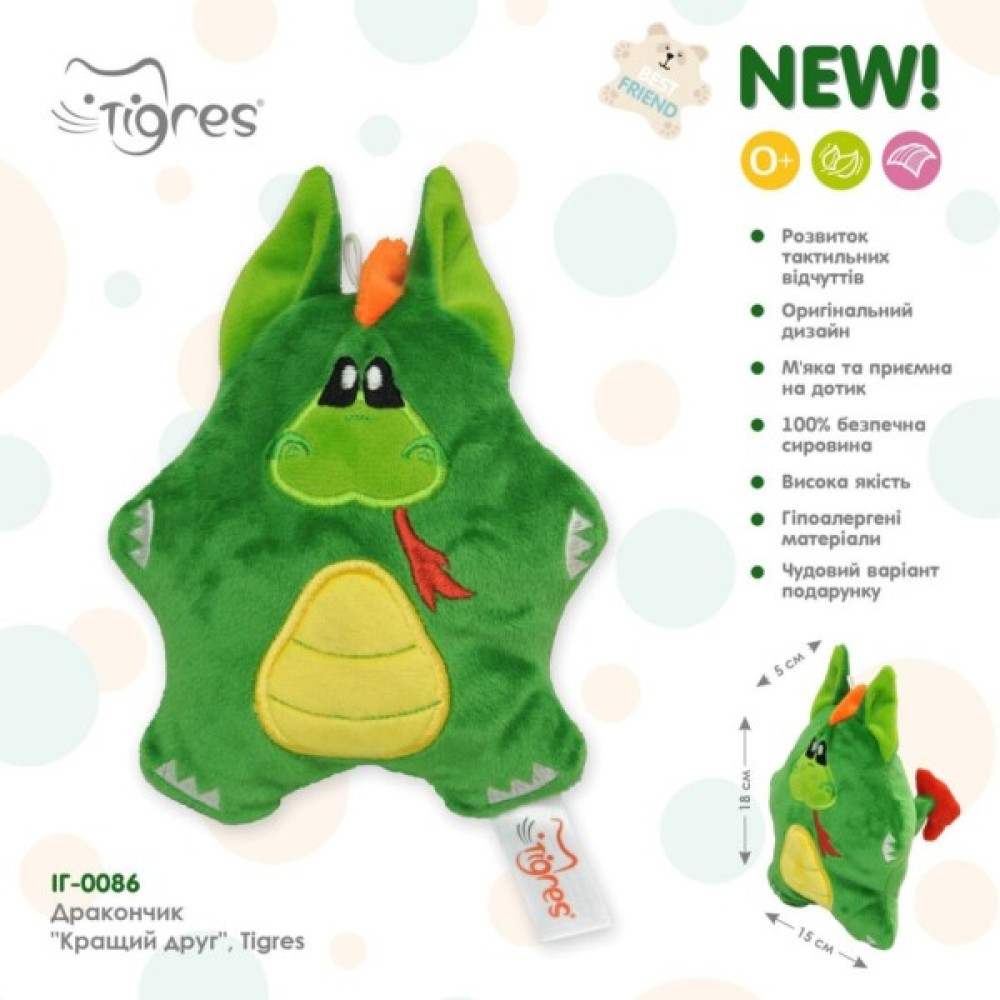 Дракончик "Кращий друг" від бренду Tigres - м’яка та ніжна, бездоганна для малюків з народження. Животик, що шарудить, приверне увагу малюка й розвиватиме тактильні відчуття, а спеціальні гранули, що використовуються при наповненні іграшки, розвиватимуть дрібну моторику руку, яка відповідає за мовлення дитини.