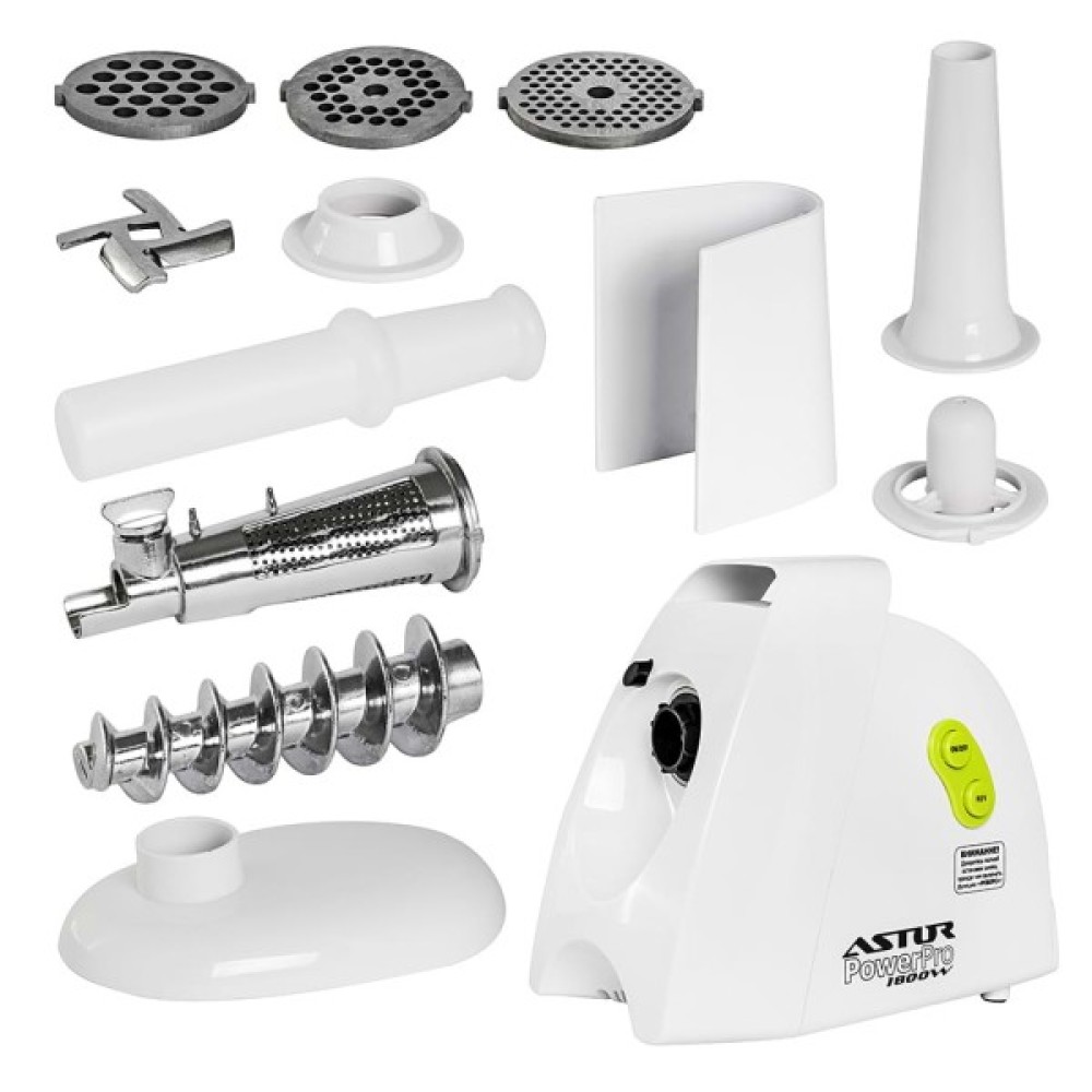 Різноманітність комплектуючихУ комплектації передбачені додаткові насадки, які допоможуть зробити безліч страв за допомогою м'ясорубки Astor MG-1901. Серед них насадки для кеббе, ковбас, томатного соку, змінні диски різного діаметру, шнек та ін. Використовуйте всі переваги, щоб урізноманітнити своє щоденне меню.