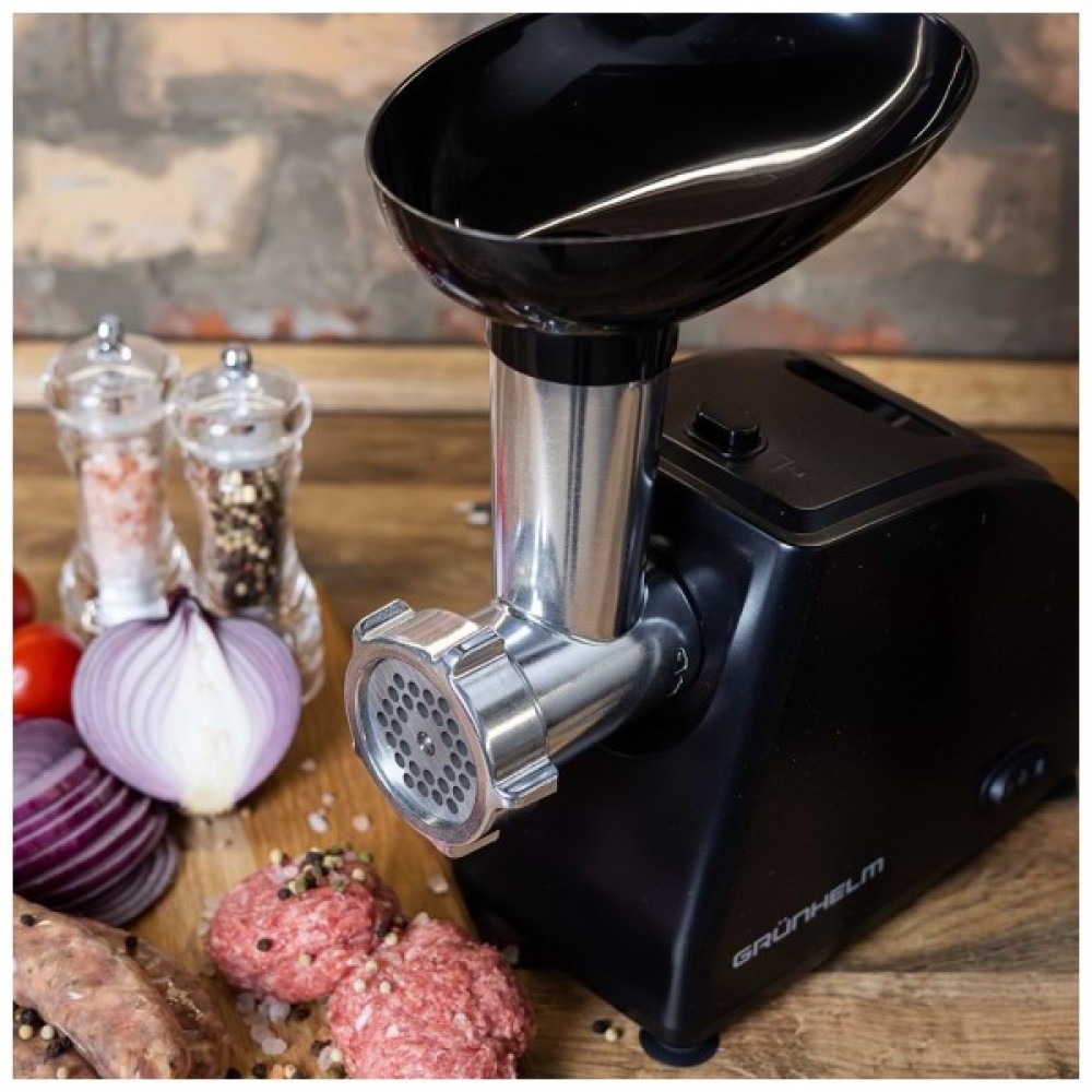 Проста компактна модель м'ясорубки Grunhelm AMG140B з ручкою має потужність 1400 Вт. Володіє низьким рівнем шуму для комфортної роботи. Для зручності користування має нековзаючі гумові ніжки. Діаметр камери м'ясорубки 54 мм. У комплекті 2 решітки для фаршу 5 і 7 мм, а також насадка-кеббе та насадка для приготування ковбас.