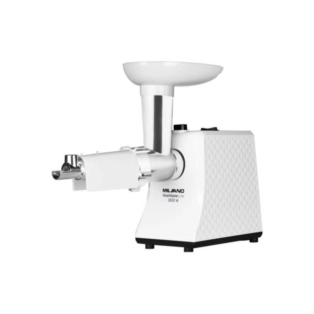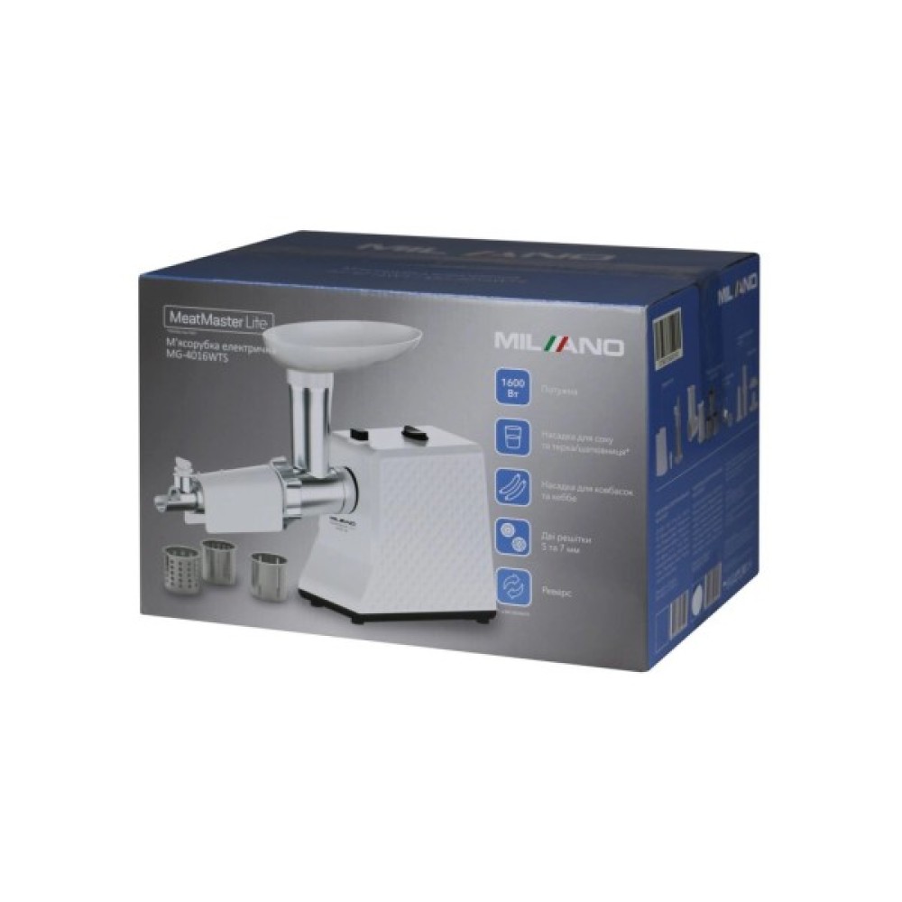 М'ясорубка Milano MG-4016WT MeatMaster Lite оснащена трьома насадками, серед яких соковижималка, насадка для кеббе та для ковбасних виробів. Також є дві решітки для різноманітного подрібнення. Додаткові можливості включають функцію реверсу, яка забезпечує зручний зворотний хід, і захист двигуна від перегріву, що підвищує безпеку експлуатації.