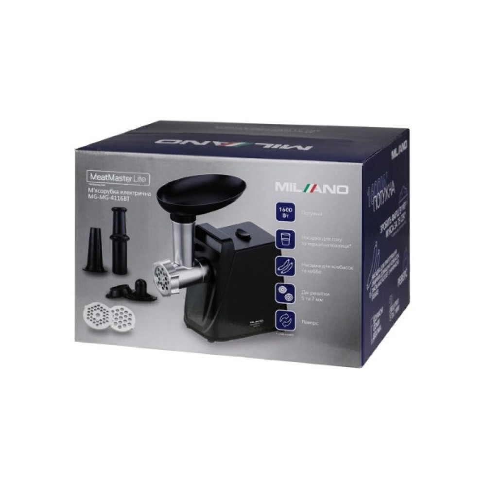 М'ясорубка Milano MG-4116BT MeatMaster Lite постачається з трьома насадками, серед яких для ковбасних виробів, кеббе і соковижималка. Також у комплект входять дві решітки для м'ясного фаршу. Нековзаючі ніжки забезпечують стабільність під час роботи, а максимальна простота використання робить цей пристрій незамінним на кухні.