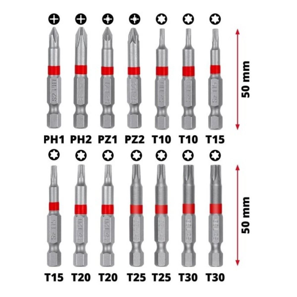 • Біти на 50 мм: PH1 - 2 шт., PH2 - 2 шт., PZ1 - 2 шт., PZ2 - 2 шт., T10 - 2 шт., T15 - 2 шт., T20 - 2 шт., T25 - 2 шт., T30 - 1 шт.