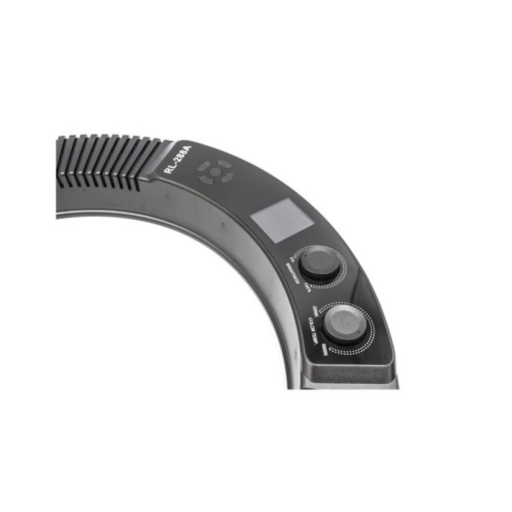 Кільцеве світло PowerPlant Ring Light RL-288A LED — потужне постійне світло, яке дасть змогу фотографувати й записувати відео професійної якості. Кільцеве світло ідеально підійде для портретних і художніх знімків. Велика світловипромінювальна площа дає нагоду позбутися різких тіней, а кругове розміщення світлодіодів забезпечить рівномірне освітлення об'єкту. Це світло обладнане якісними світлодіодами з різною температурою світла (144 шт. — 3200 К, 144 шт. — 5600K). Для регулювання температури світла є плавний димер на зворотному боці корпусу. Там само міститься й регулятор потужності світла, який дає нагоду регулювати світло від 10 до 100%. На цифровому дисплеї на задній панелі приладу відбивається вся необхідна інформація про поточні параметри приладу та стан заряду акумулятора. Світло живиться від мережі або акумуляторів типу Sony NP-F. Кронштейн для встановлення освітлювача дасть змогу встановити його на будь-яку студійну стійку. Освітлювач у формі кільця дасть змогу вам створити дуже цікавий ефект під час запису відео та фотографування як у студії, так і під час виїзного знімання.