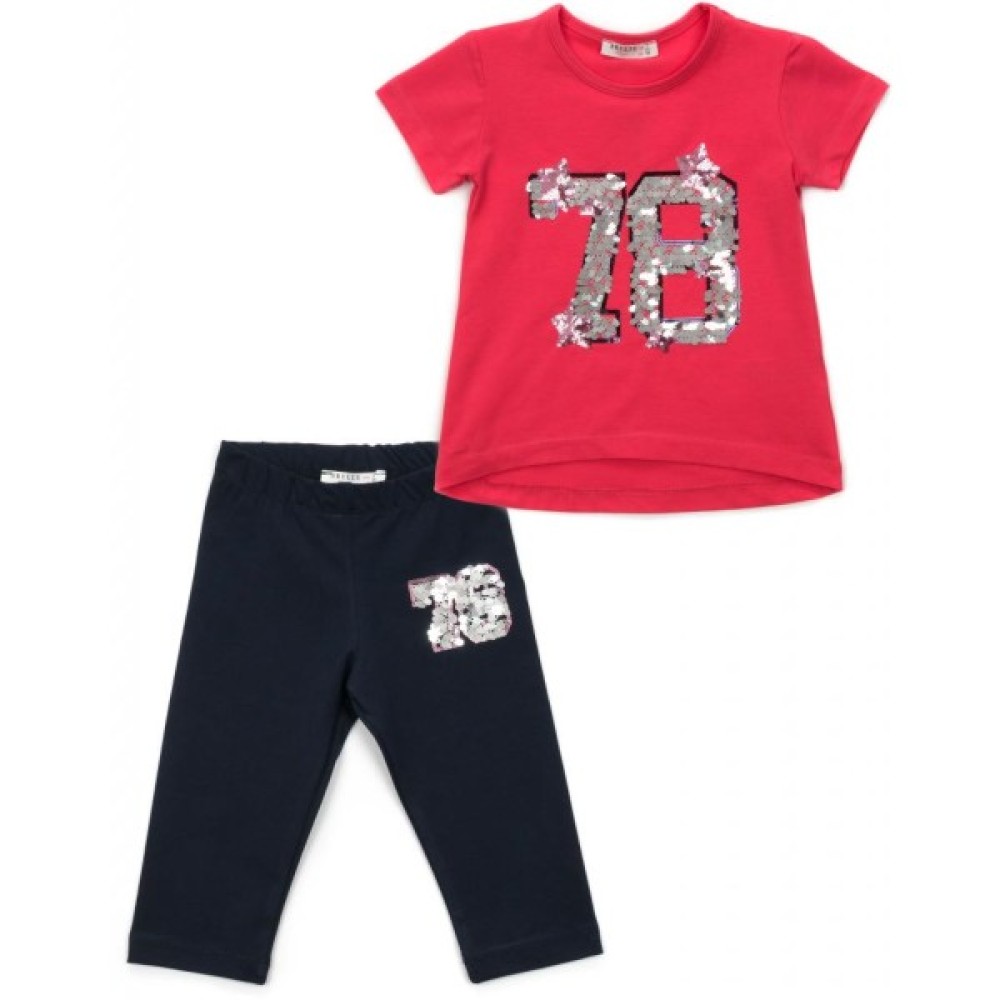 Відмінний літній комплект - двійка з тонкого турецького трикотажу для активної дівчинки: темно - рожева футболочка і темно - сині капрі. Тканина тонка, дуже приємна на дотик.