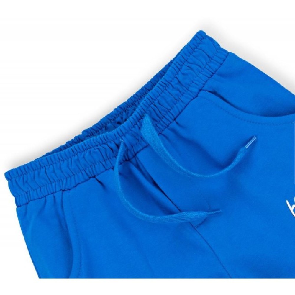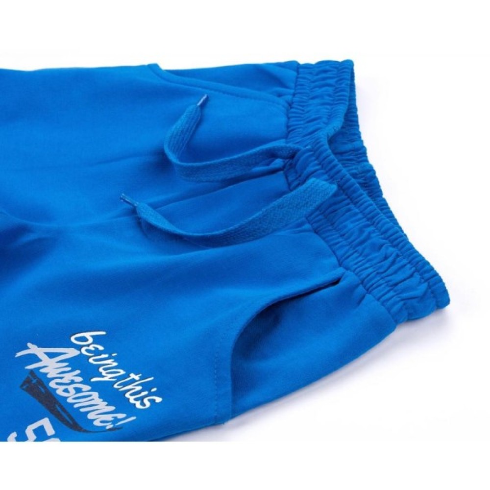 Тканина тонка, дуже приємна на дотик, літня і дихаюча (100% бавовна). Горловина кругла, оброблена м'якою трикотажною резинкою. Шорти середньої довжини яскравого василькового кольору з двома прорізними кишенями. Пояс широкий, еластичний, на гумці, доповнений декоративним шнурком. На лівій частині шорт так само є принтований напис. Шорти виконані з більш щільної тканини, ніж футболка.