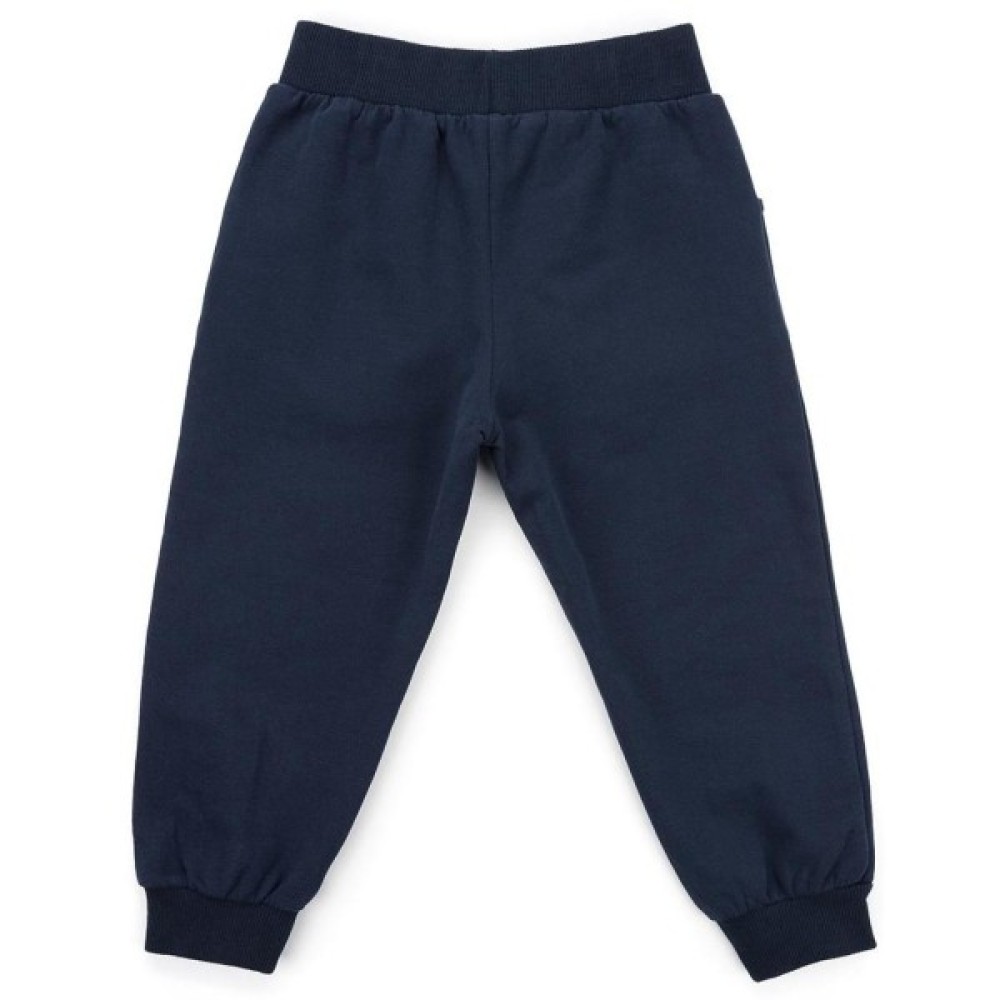 Затишні штани темно-синього кольору на манжетах, з двома прорізними кишенями, так само прикрашені у верхній частині нашивкою м'яча. Еластичний пояс і манжети, в подвійну трикотажну «гумку», забезпечать затишок і оптимальну посадку по фігурі. Пояс додатково посилений широкою вставленою «гумкою». Шнурок декоративний.