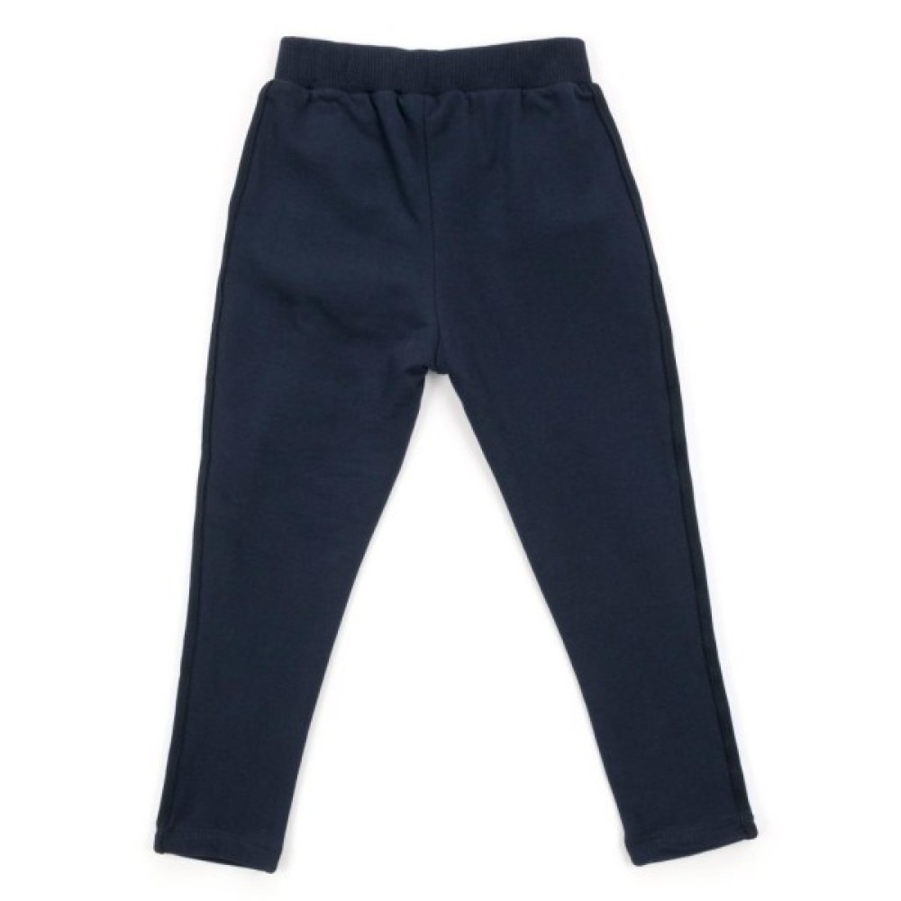 Зручні, завужені до низу брюки (без манжета) прикрашені по бічній лінії настроченим трибарвним лампасом. Еластичний широкий пояс з подвійноі трикотажноі «гумки», посилений щільною вставленою всередину «гумкою», забезпечить оптимальну посадку по фігурі. У брюках є дві врізні кишені.