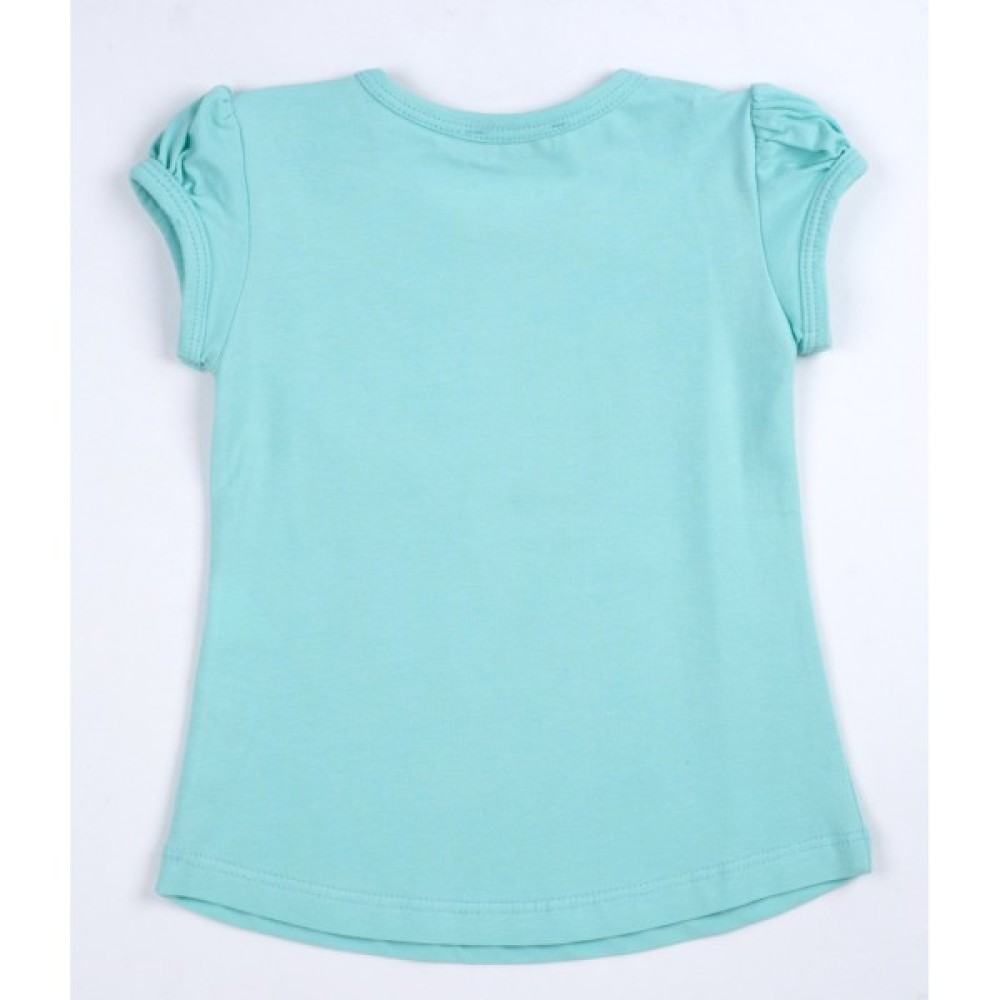 - Затишна та дуже мила футболка А-силуету з короткими рукавами-ліхтарик. Перед футболки прикрашений дуже красивим, кольоровим принтовим малюнком з додаванням сріблястих глітерних блискіток. Круглий виріз горловини оброблений м'якою трикотажною бейкою. Для маленьких розмірів в плечовому шві передбачена застібка на фірмові перламутрові ґудзики.