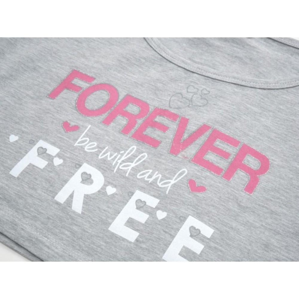 Топ - укорочена широка футболка сірого меланжевого кольору, з суцільнокроєним рукавом і трохи поглибленим вирізом горловини, що дає можливість, при бажанні, приспустити топ з одного плеча. Прикрашений яскравим принтом «FOREVER», контур якого оформлений гліттерним напиленням. Тканина топа трохи щільніше, ніж у майці.