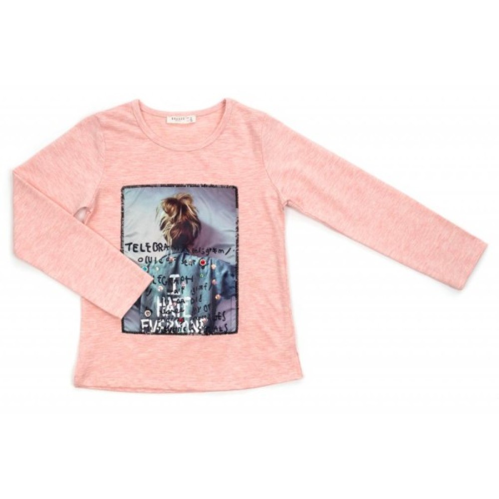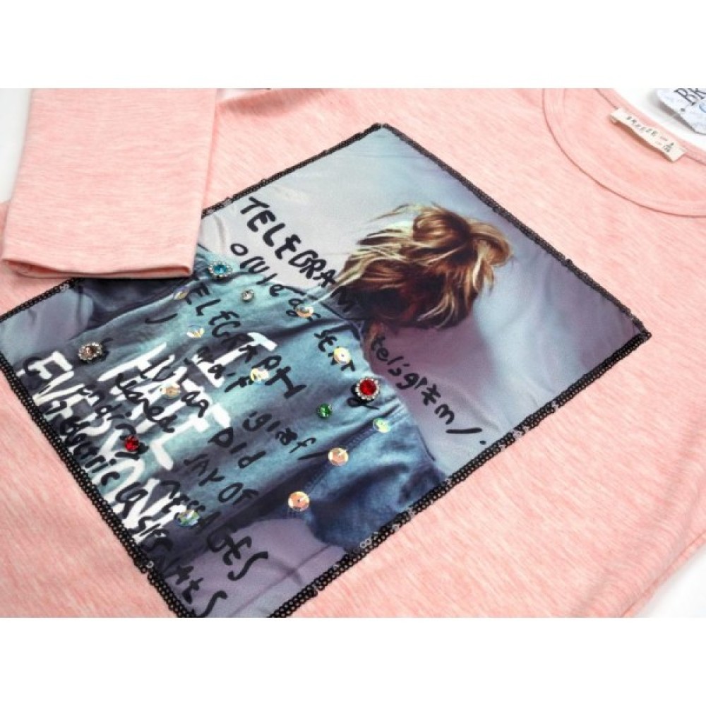 Яскравий симпатичний лонгслів прямого силуету, трохи розширений до низу, з довгими рукавами, прикрашений стильною атласною фото-картинкою з дуже ефектним сяючим декором, в обрамленні пришитих дрібних чорних паєток, без сумнівів сподобається вашій модниці, Горловина овальна, оброблена еластичною трикотажною бейкою.