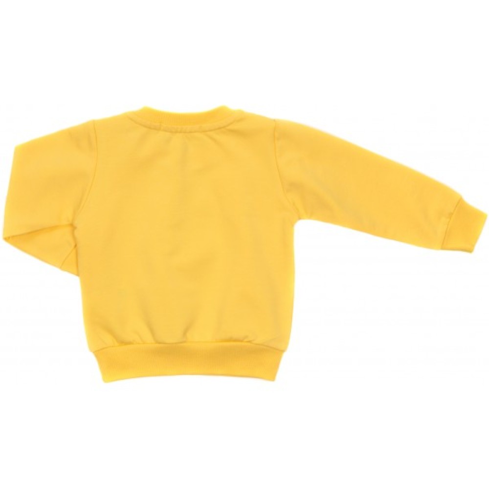 Світшот вільного крою, красивого лимонного кольору, спереду прикрашений принтовим малюнком зайчика з бантиком. Бантик, вушка та контур зайчика оформлені пришивними паєтками різного кольору. Манжети рукавів, кругла горловина та лінія низу світшота оброблені подвійною трикотажною гумкою. У плечовому шві є застібка на два перламутрові гудзики.