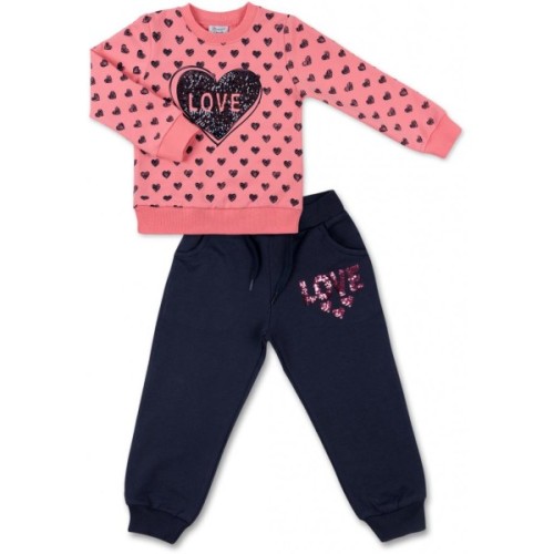 Модний комплект в спортивному стилі для дівчинки складається з світло-лососевого світшоту, з милими сердечками, і контрастних темно-синіх штанів.