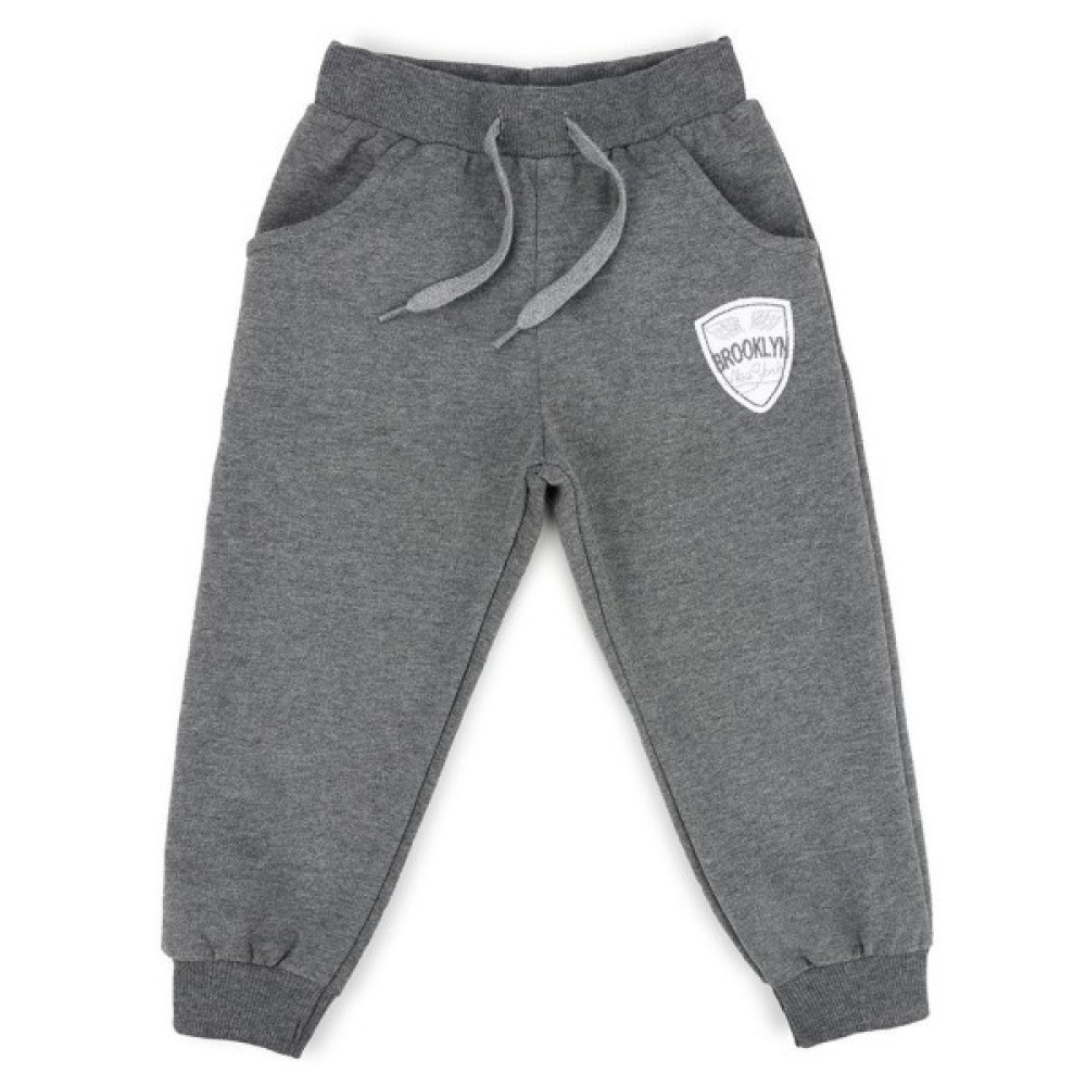 Затишні штани темно-сірого кольору на манжетах, з двома прорізними кишенями, так само прикрашені у верхній частині нашивкою елементів аплікації, що перегукується з аплікацією зі світшота. Еластичний пояс і манжети, в подвійну трикотажну «гумку», забезпечать затишок і оптимальну посадку по фігурі. Пояс додатково посилений вставленою всередину широкою «гумкою». Шнурок декоративний.
