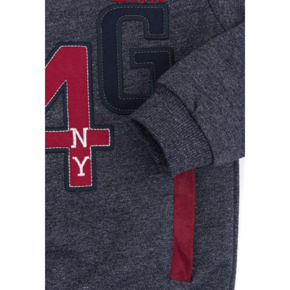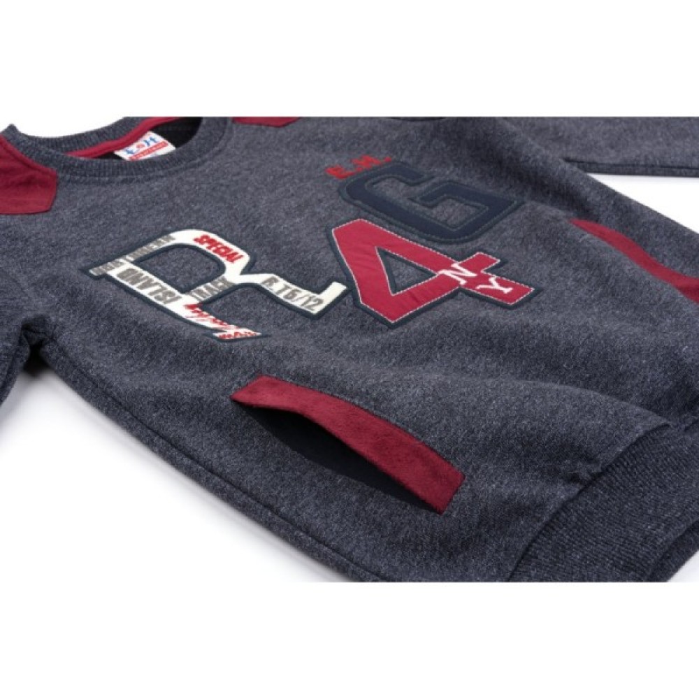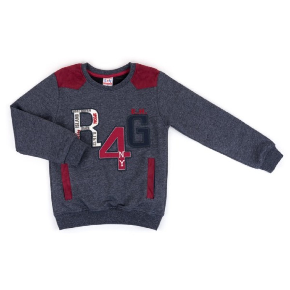 Затишний світшот, прямого силуету, з двома передніми кишенями, зшитий з щільного турецького трикотажу з легким ефектом махри всередині. Прикрашений настроченою контрастною аплікацією «R4G», з елементами вишивки, і вишневими плечовими деталями з екозамша. Круглий виріз горловини, низ світшоту і довгі рукава з манжетами оформлені подвійною трикотажною резинкою.