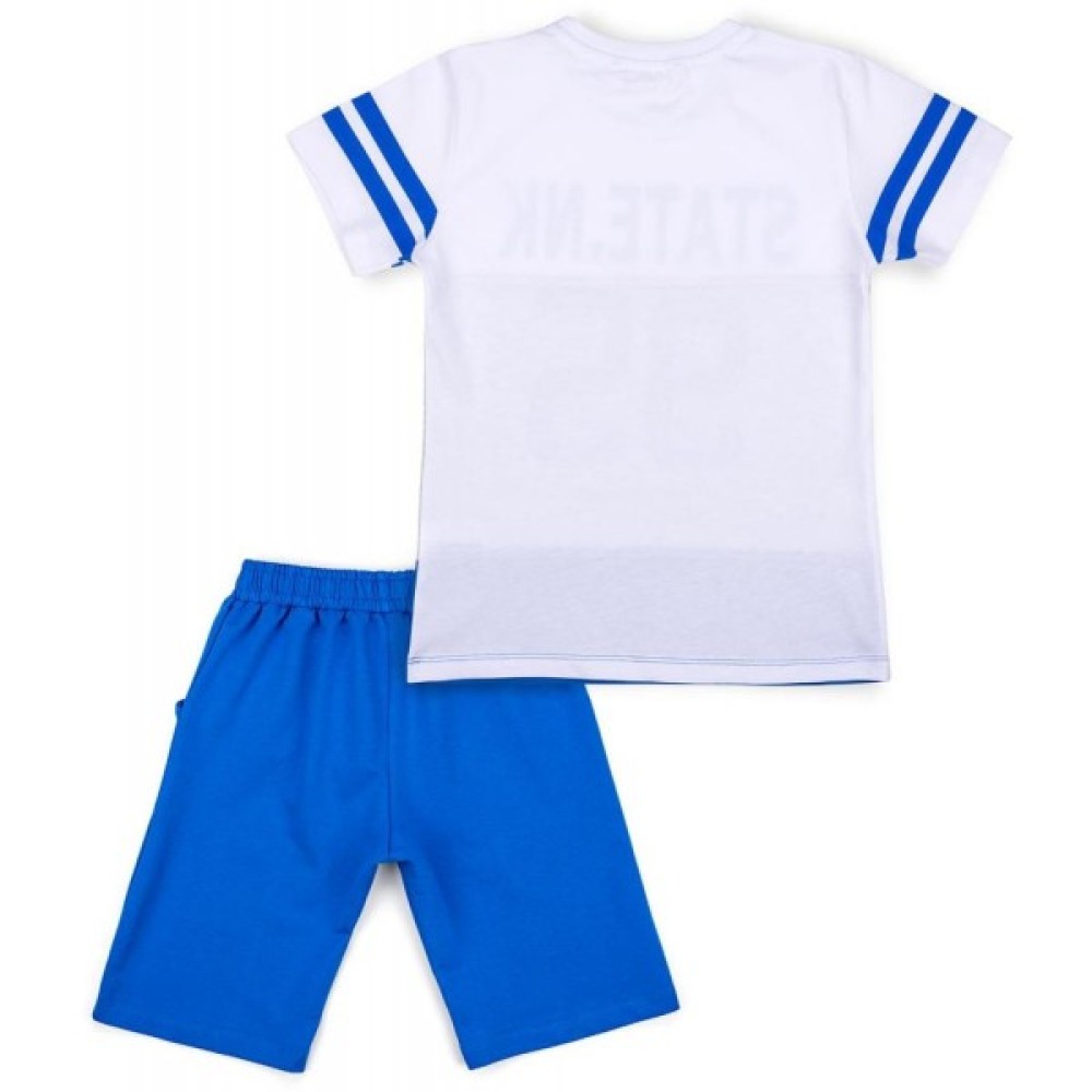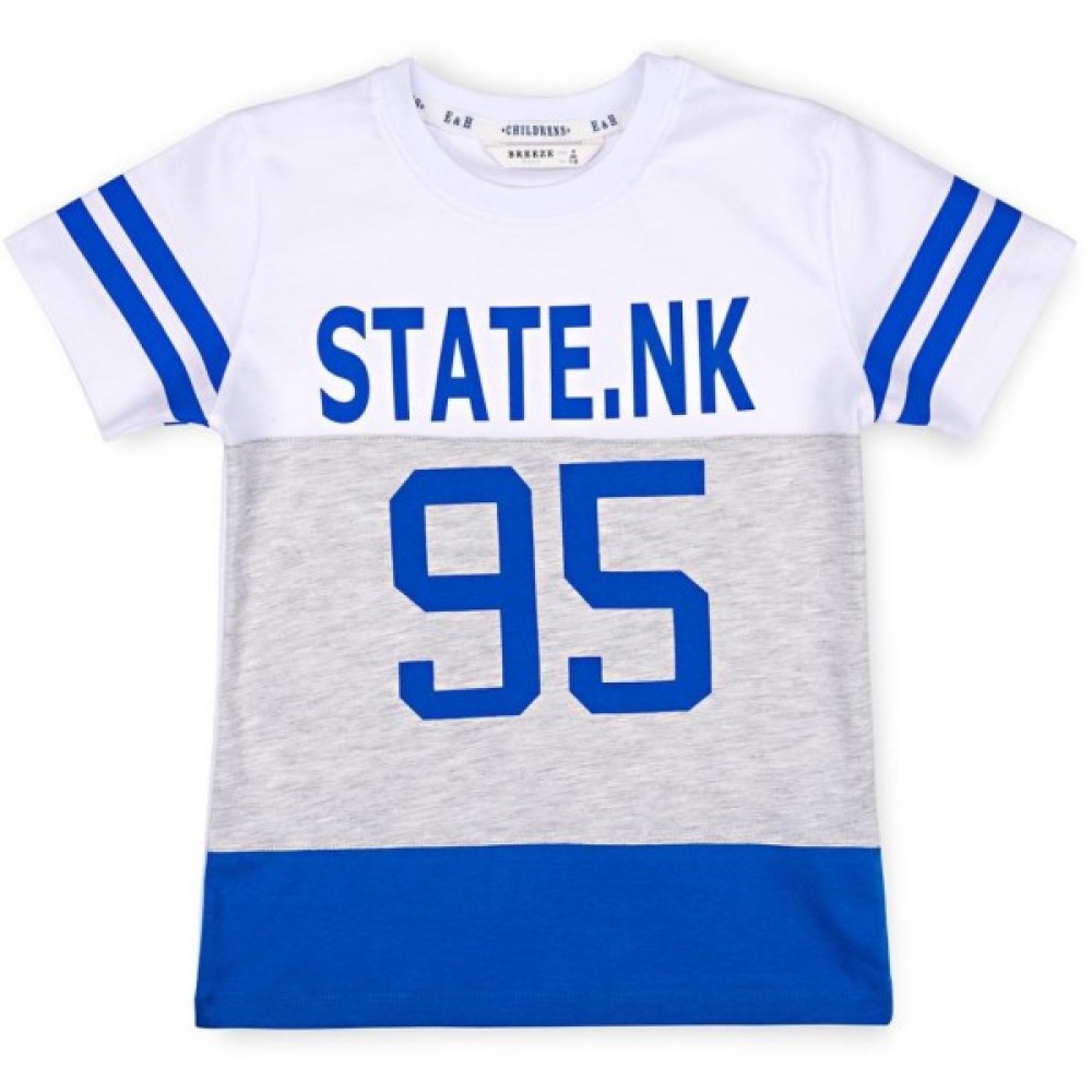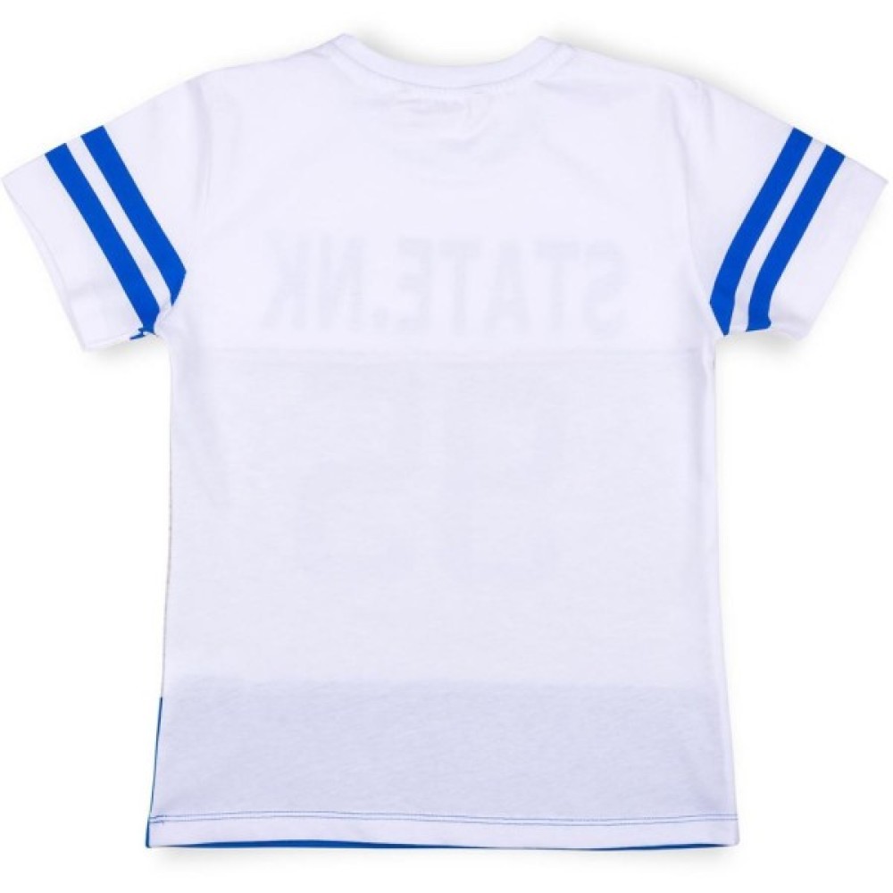 Футболка вільна, прямого крою, з коротким рукавом і круглою горловиною. З переду футболка з трикотажу 3-х кольорів, а спинка - біла однотонна. Перед прикрашений стильним написом «STATE.NK 95» і двома принтовими смужками на рукавах красивого синього кольору. Горловина оброблена м'якою подвійною трикотажною резинкою.
