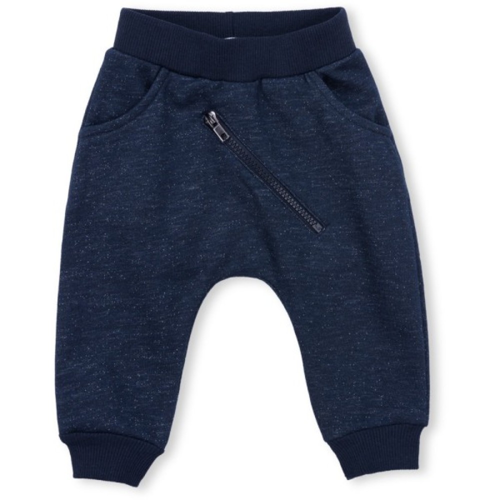 Зручні брючки на манжетах, з двома прорізними кишенями з якісного, еластичного, темно-синього в "цяточку", трикотажу. Прикрашені розташованою по діагоналі "тракторною" блискавкою-обманкою, розкривши яку, з'явиться тонка смуга червоного кольору. Еластичний пояс і манжети з подвійної трикотажної «гумки», вільний крій штанців - без середнього шва (шва сидіння), забезпечать дитині повну свободу рухів і оптимальну посадку по фігурі.