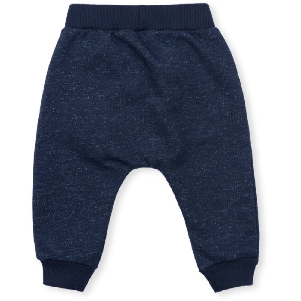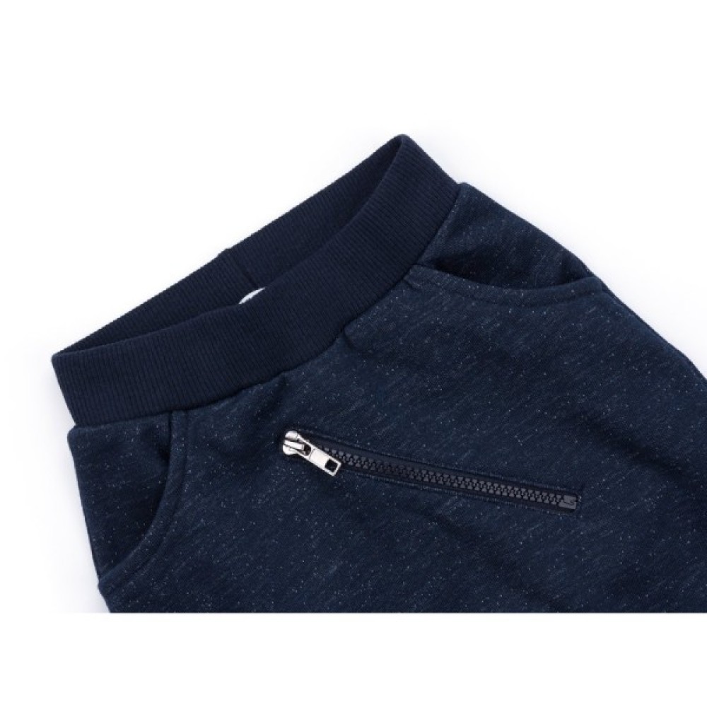 Зручні брючки на манжетах, з двома прорізними кишенями з якісного, еластичного, темно-синього в "цяточку", трикотажу. Прикрашені розташованою по діагоналі "тракторною" блискавкою-обманкою, розкривши яку, з'явиться тонка смуга червоного кольору. Еластичний пояс і манжети з подвійної трикотажної «гумки», вільний крій штанців - без середнього шва (шва сидіння), забезпечать дитині повну свободу рухів і оптимальну посадку по фігурі.