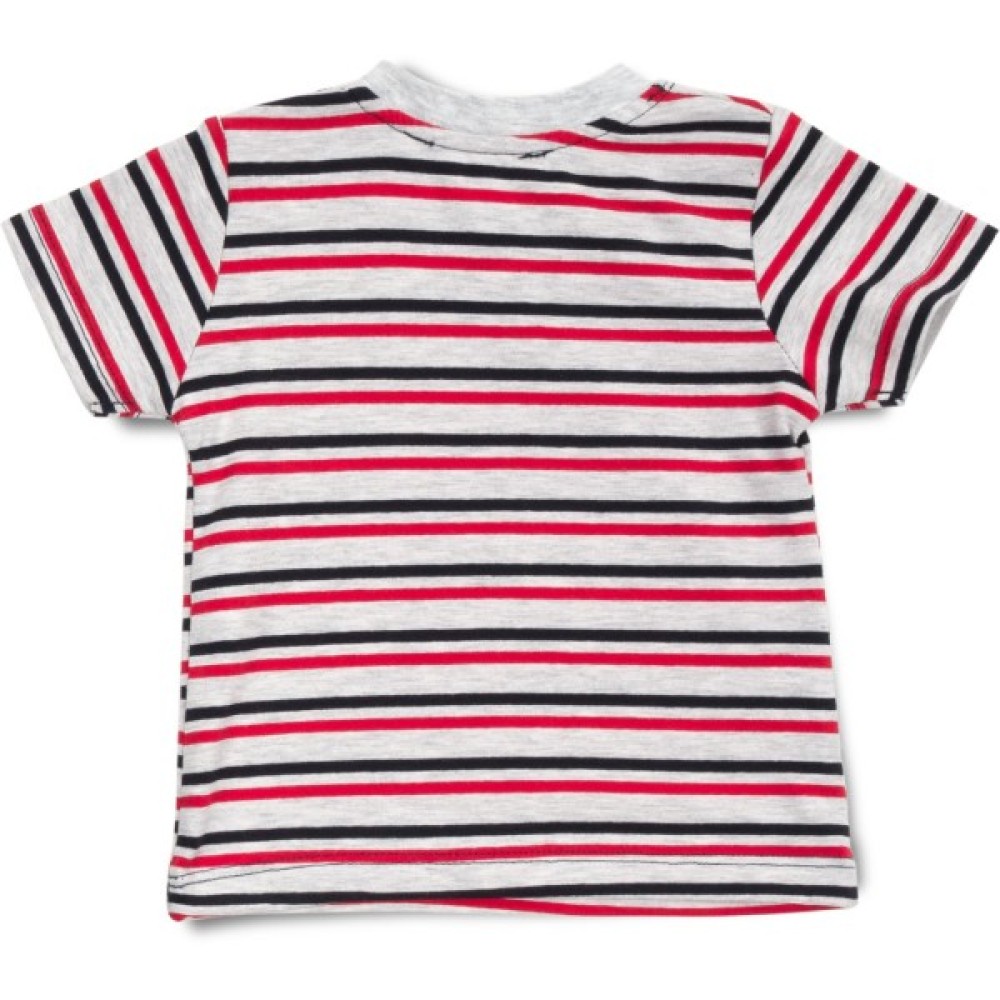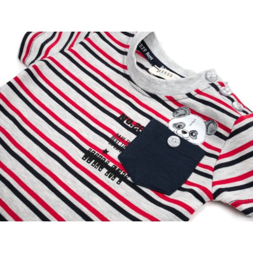 Футболочка прямого силуету, прикрашена на грудях настроченою накладною кишенею темно-синього кольору, з якої «визирає» ведмедик. Рукава короткі. Овальна горловина оброблена м'якою, якісною, подвійною, трикотажною резинкою. На лівому плечі застібка на фірмові перламутрові ґудзики, яка полегшить процес надягання. Основний колір бежево - сірий меланжевий, в чорну і яскраво - червону смужку (ширина смужки 0,5 см).
